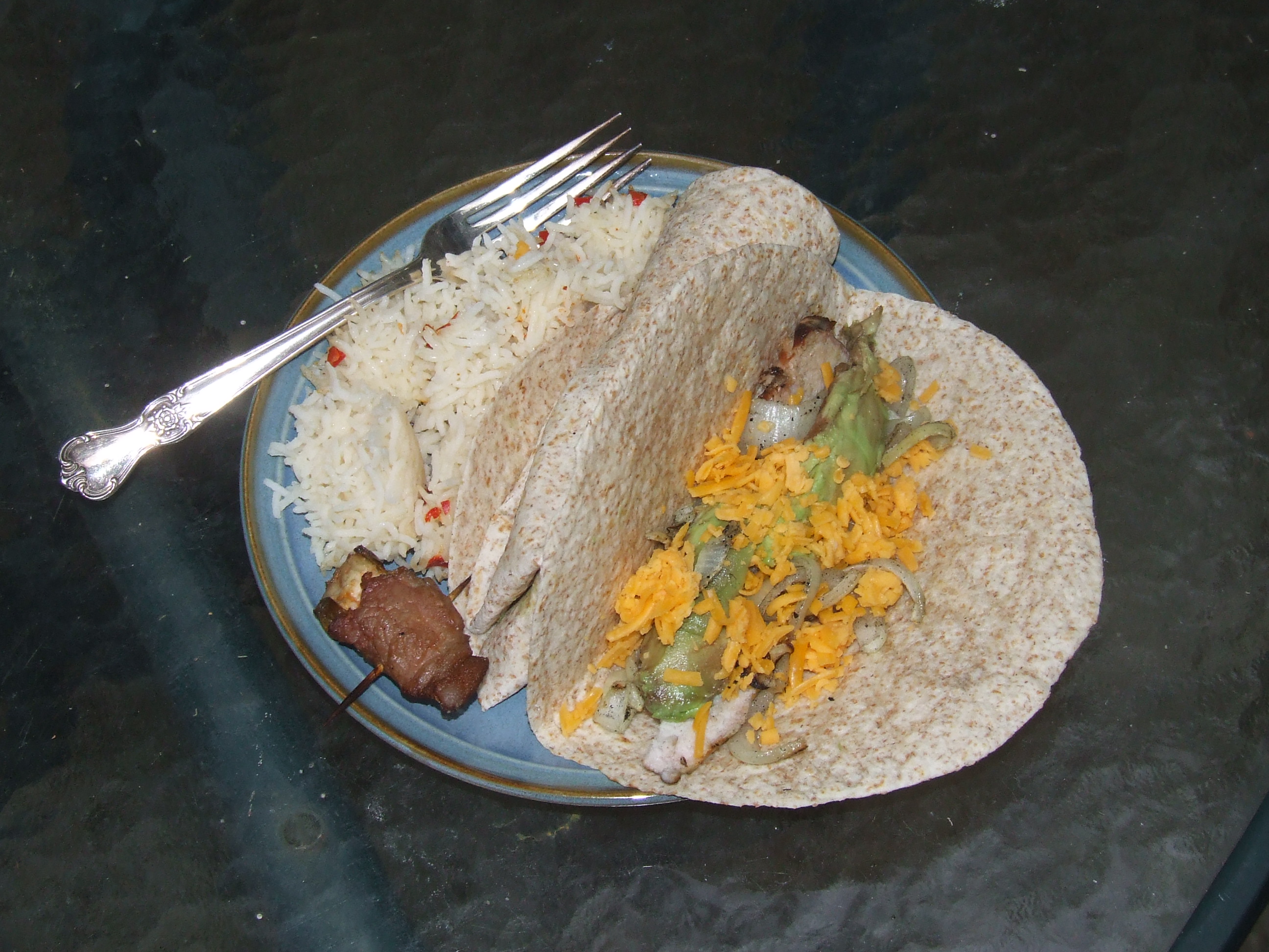 This is what I had for dinner the other night. Grilled pork loin fajitas (pork marinated in lime juice and garlic) with grilled onion, topped with avocado and cheddar; baked rice with home-grown jalapenos diced; and grilled jalapeno poppers. Dessert: Chocolate chipotle pudding cake.