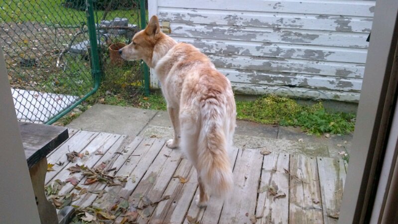 I invited Achilles inside and he declined. Chili dog is by and large a very good boy in the back yard. He very rarely digs, does not bark without reason, is content to watch, listen, and smell the world. Achilles is generally welcome to be outside unsupervised as long as he wishes.