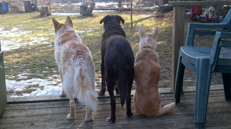 Weak sunshine and very little wind drew all five of us outside – if only for a short time. Achilles, Kendal, and Stella surveyed the backyard for a moment.