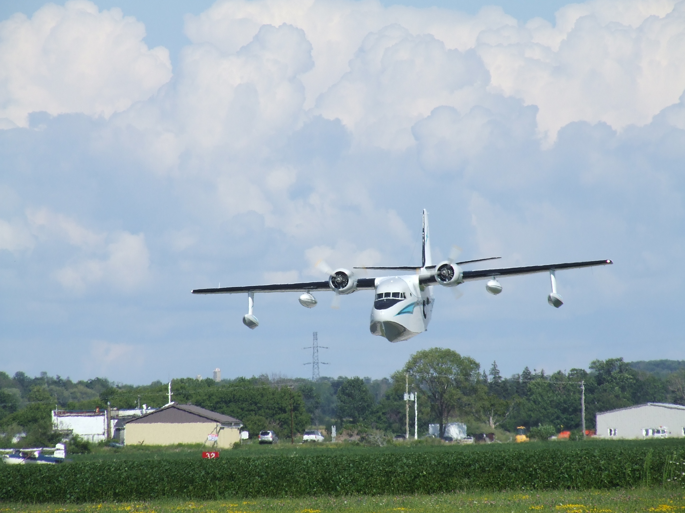 A neat thing about living in Goderich and being an airplane buff was Sky Harbour Aircraft, an airplane restoration business. Sky Harbour restored quite a few aircraft – warbirds, small business jets, airline-size jets (once I saw a 737 in private livery) before going out of business in. This Grumman Mallard (I think) amphibian had been completed and being returned to its owner. The flight crew took it for a demonstration or acceptance flight. In the process they buzzed the airport