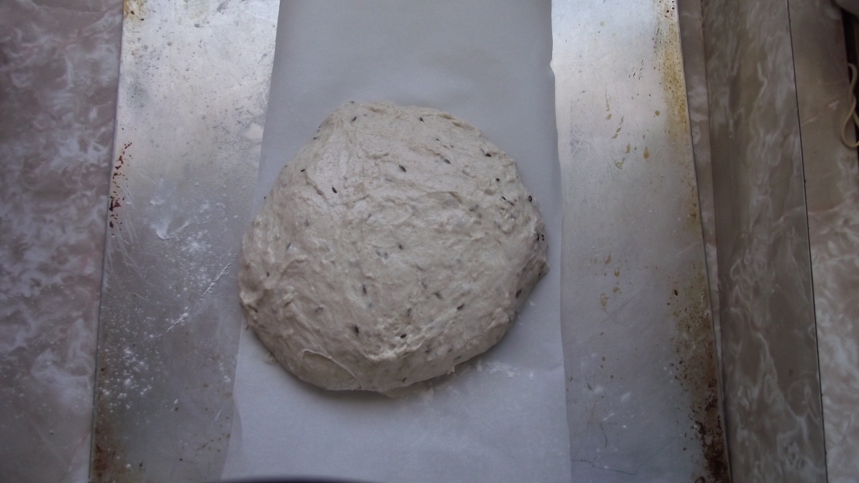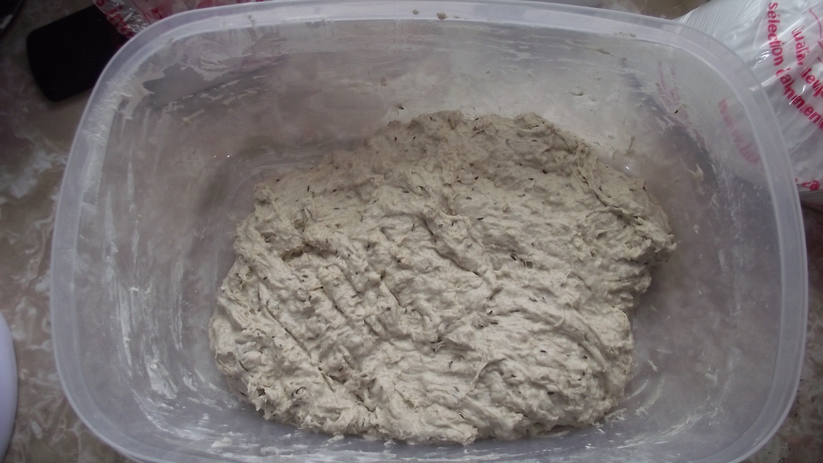On Friday I made a batch of dough following the Deli Rye dough recipe. The ingredients are few – water, yeast, salt, caraway seeds, rye and all-purpose flours. The process is quite simple – mix everything without kneading and let rise at room temperature. This took less than 15 minutes. Because our kitchen is cold at this time of year we let it rise for two hours. Here’s a look at the dough.