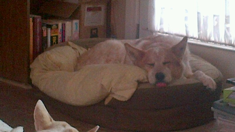 This is a poor quality photo but the look is priceless. Achilles completely relaxed. He is such a treasure, helps put my cares and concerns in perspective. I am so blessed, life is good.