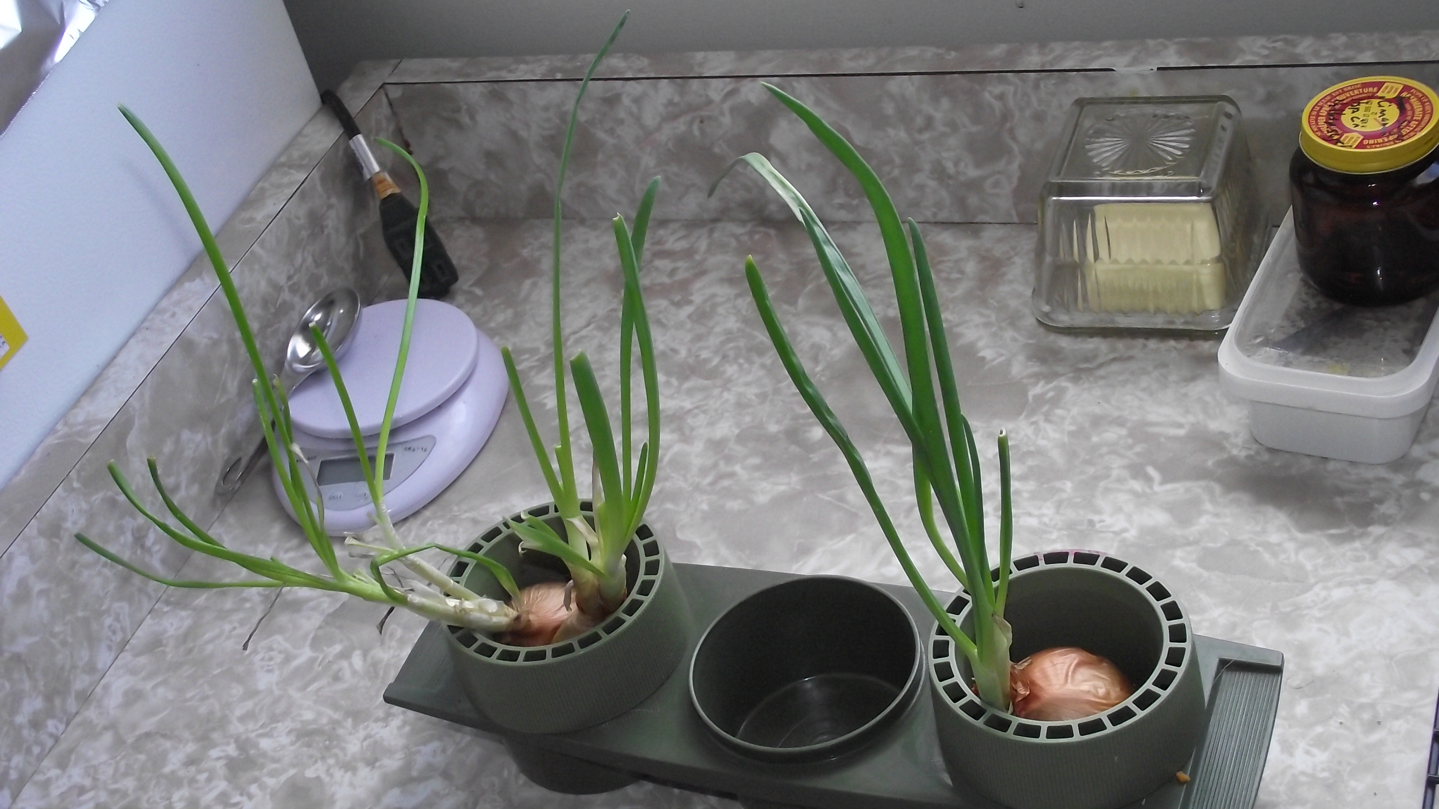 When these became undesirable to eat she put them in containers with a little water covering just the bottom of the bulb. After several days they sent out green shoots, so Voila! Fresh, homegrown ‘green’ onions and just enough to use before they turn into compost food.