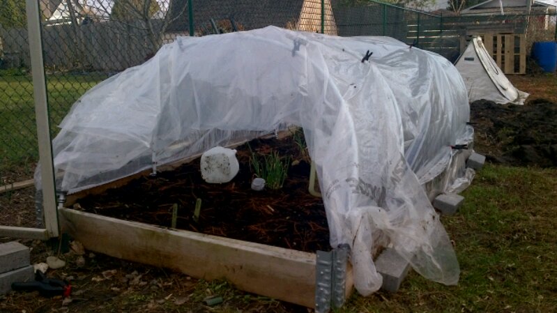 Two weeks ago we erected this hoop house over the raised bed. Last night we had a wicked thunderstorm with about 15mm of rain, wind gusts to perhaps 70 kph, and about five minutes of pea sized hail. We were very pleased to see the hoop house still in place today, protecting our mesclun mix, bulls blood beets, radishes, carrots, and other seedlings.