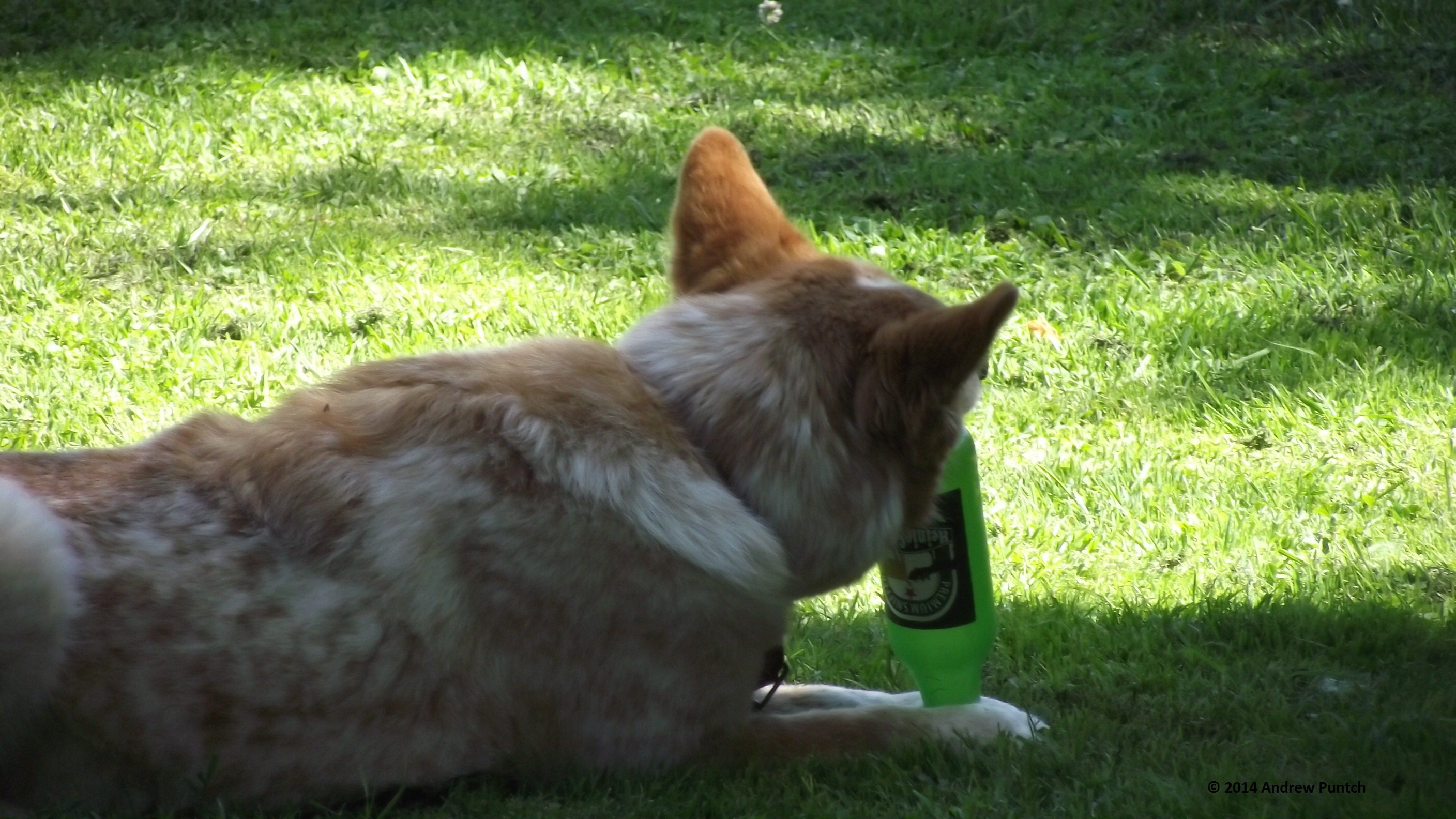 I very rarely buy toys for the dogs. I couldn’t resist a squeeky toy shaped like a beer bottle. Having an aggressive squeek, labelled ‘HeinieSniffin’, and depicting one dog sniffing another’s butt it was too good to pass up. Alas, it lasted about ten minutes in Chilidog’s strong jaws. I was compelled to take it up lest he inadvertently swallow a piece of it. I forgot just how aggressive a chewer he is.