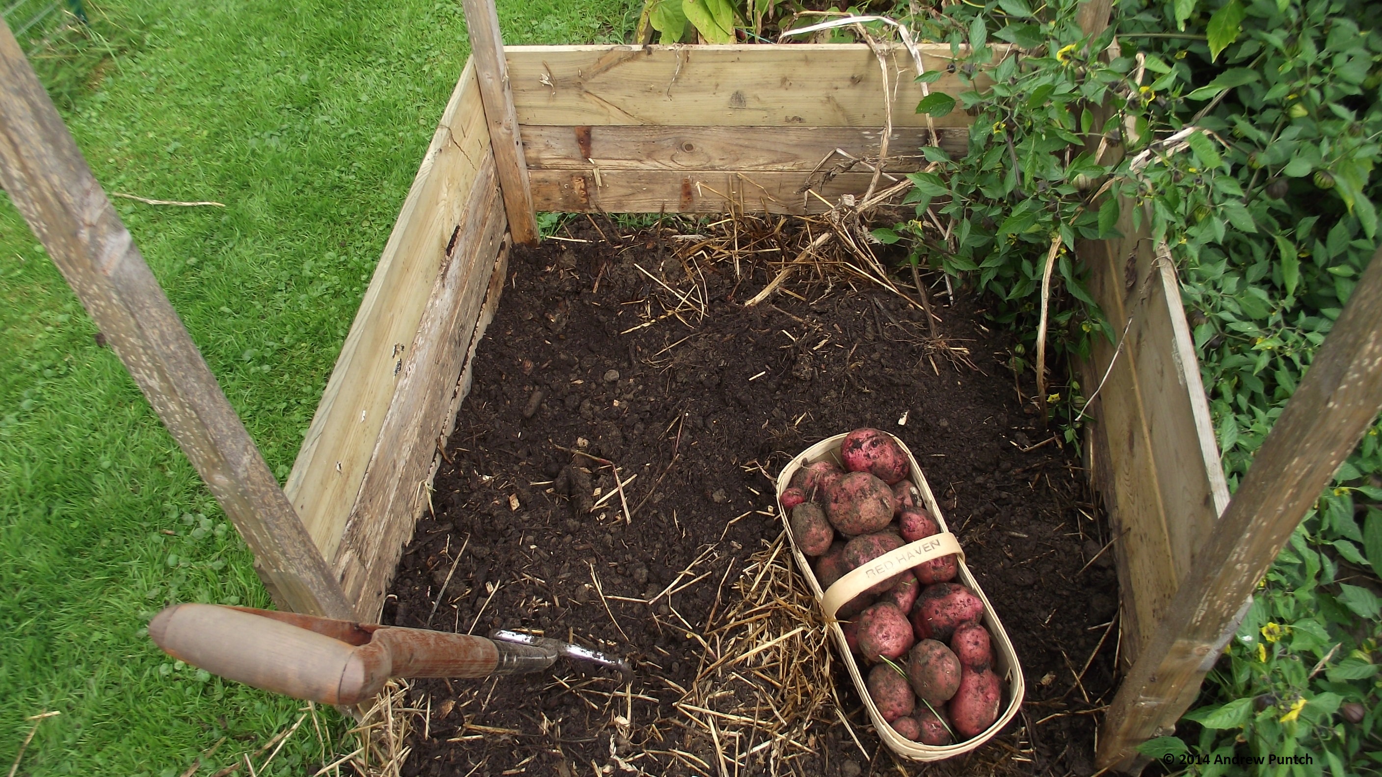 Our potato box was very productive. Last spring we started our potatoes in this approximately 3′ x 3′ box. As the vines grew we added boards to the box frame, layer by layer, and piled in straw with each layer until the straw was about 15″ deep. I harvested the bounty today and reaped about ten lbs. of potatoes and there may be even more below the level I dug to. Ten lbs. is certainly not enough to last all winter but we now have the confidence of knowing the method works for us. The earth I turned over is amazingly rich in organic matter, earthworms, and other good stuff. I suspect we’ll try again next year.