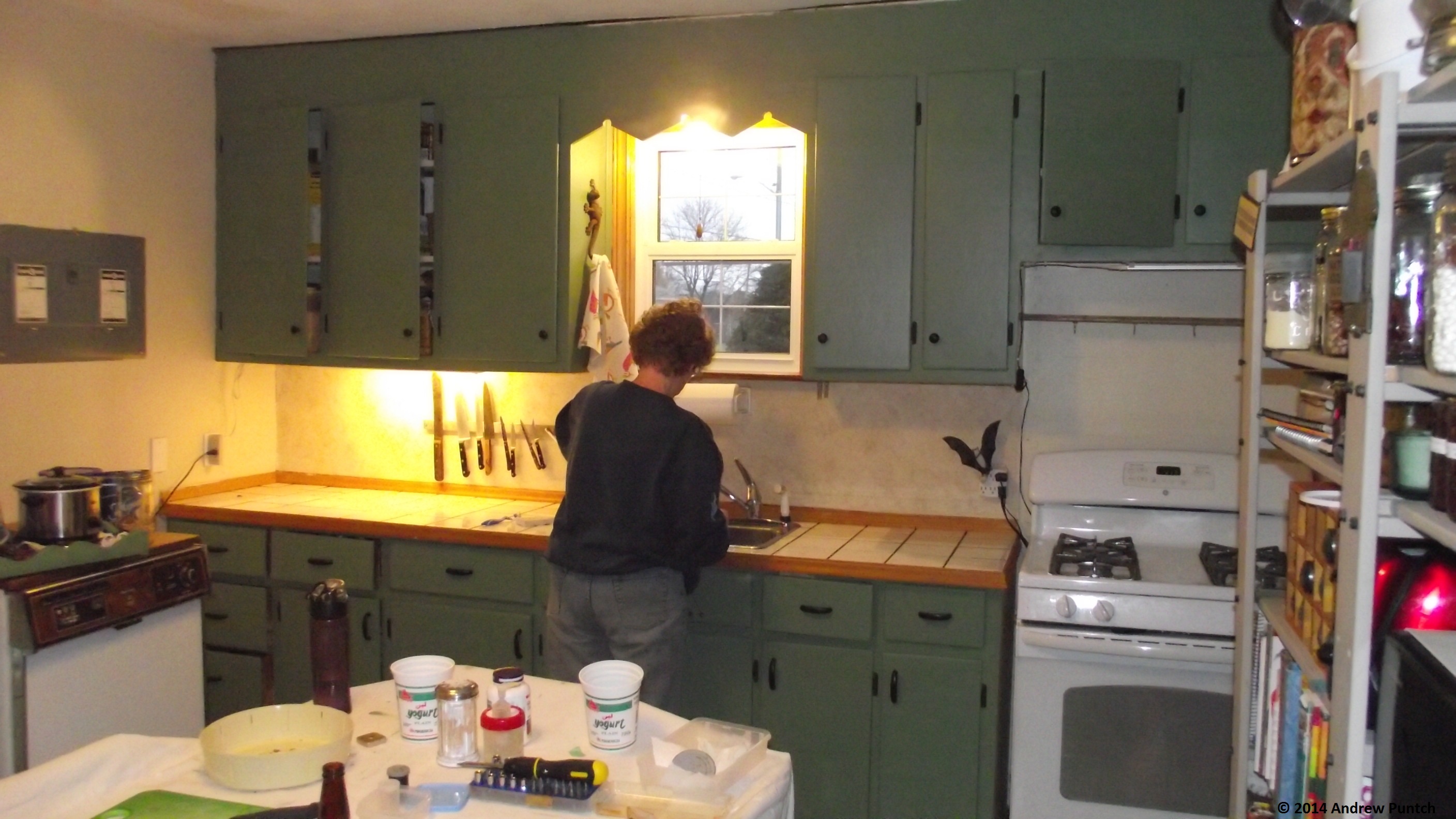 Cabinets done, and in time for Christmas. Faye is thoroughly cleaning the sink and counter (if you want a job done thoroughly you can count on Faye.). The counter is tile which we’d like to replace; it will have to wait until the next refresh.