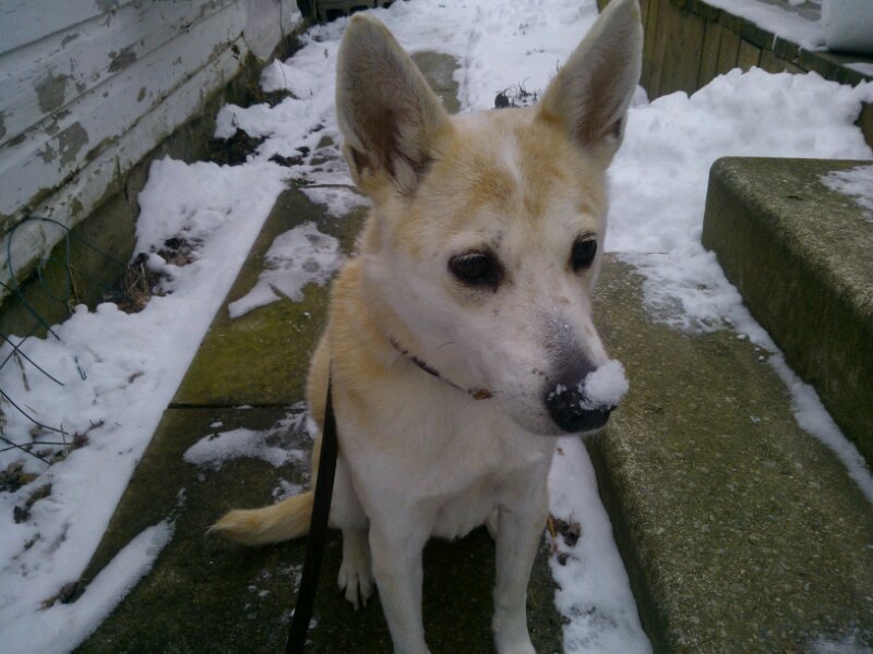 Faye and I took the cattle dogs on the long walk today. Stella will often shove her nose into a snowbank. When we returned home I noticed that Stella had a snowball on her nose. She was completely unfazed by, seemimgly oblivious to, it. I did not, could not, stage this.