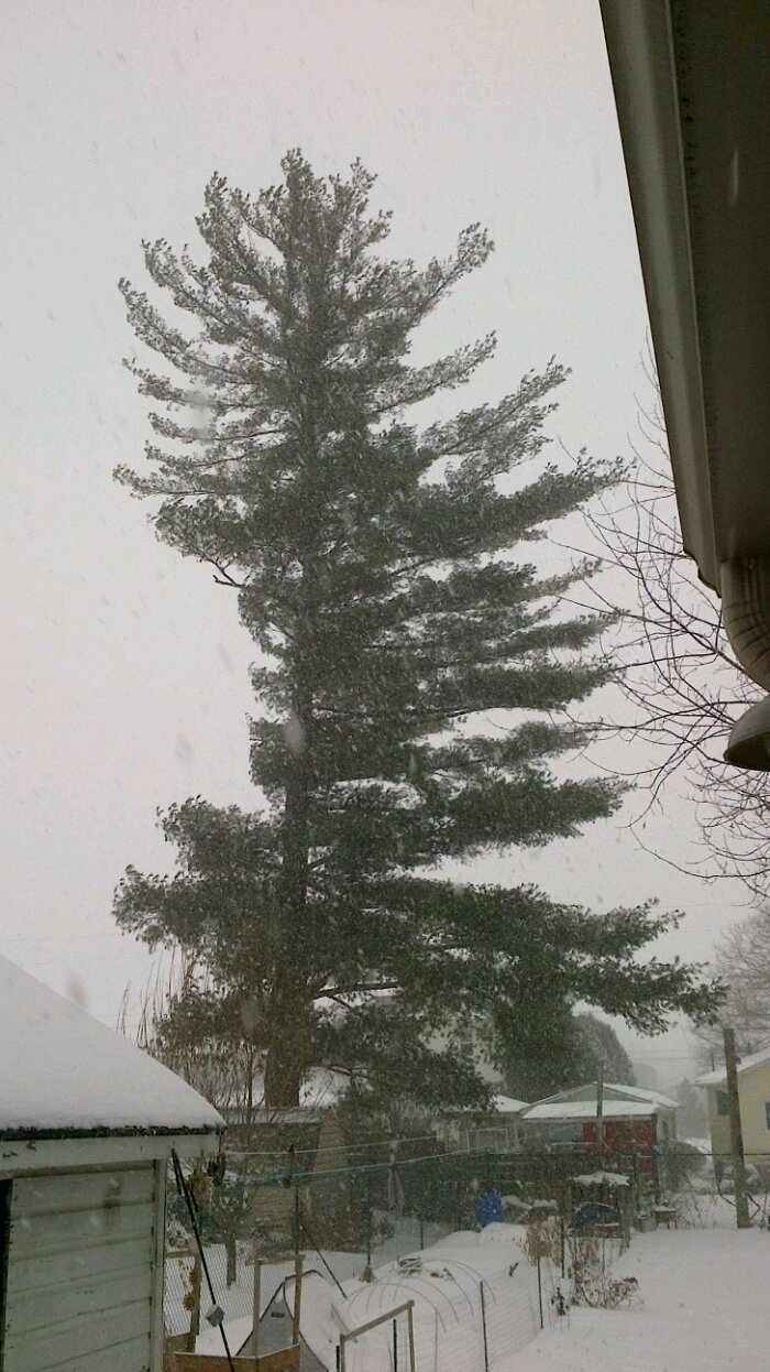 We are under a Winter Storm Warning. It has snowed all day, the snow began falling in earnest late this afternoon. The pine tree, shrouded in snow, is unimpressed, it has certainly seen far more notable storms. I measured about 10 centimeters before taking this photo. We are at about 12 now I think, much more to come, much more to shovel. Now the wind is blowing. That is fine with me. It is winter after all and I accept it. I am grateful to have a snug home, and grateful to live in a land of four seasons.