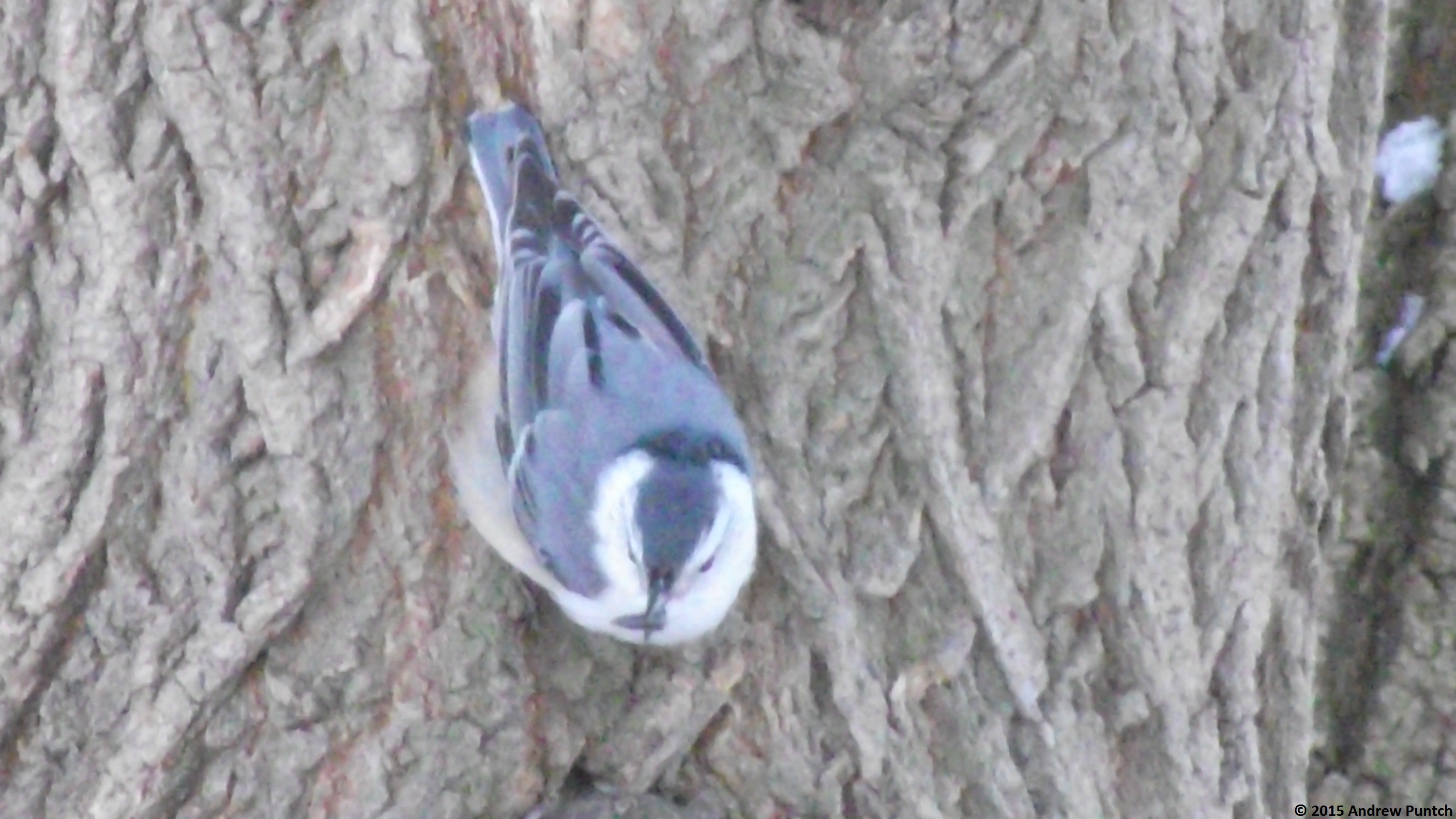 I sometimes think of the White-breasted Nuthatch as the clown of the songbirds. It moves upside down. It wears a distinctive, funny suit. It has a funny little call, surveys the scene by turning its head every which way. Flits down to snatch a seed then quickly retreats to the safety of a nearby tree to open and devour its prize.