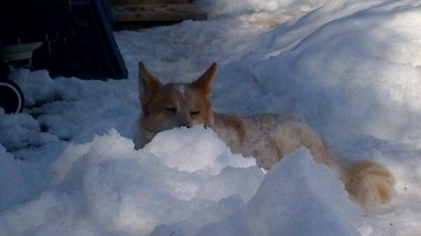 It has been a lovely day. Sunny, temperature about 3 Celsius, light southwest wind. We spent time outside doing a little cleaning up. The dogs also came out for varying lengths of time. Piles of snow notwithstanding, Achilles dozed. I sneaked a photo.