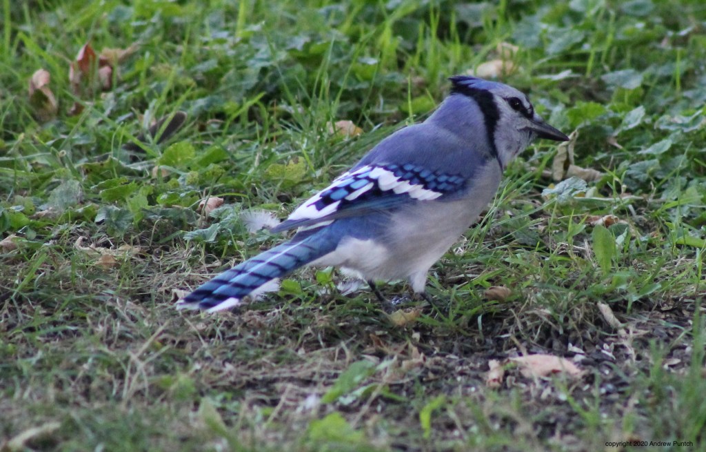 A Blue Jay searches for tidbits under a hanging sunflower seed feeder .