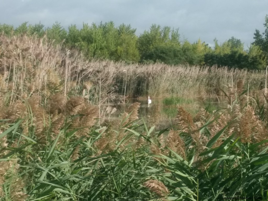 A Mute Swan hovers in the distance, on the far side of the pond.
