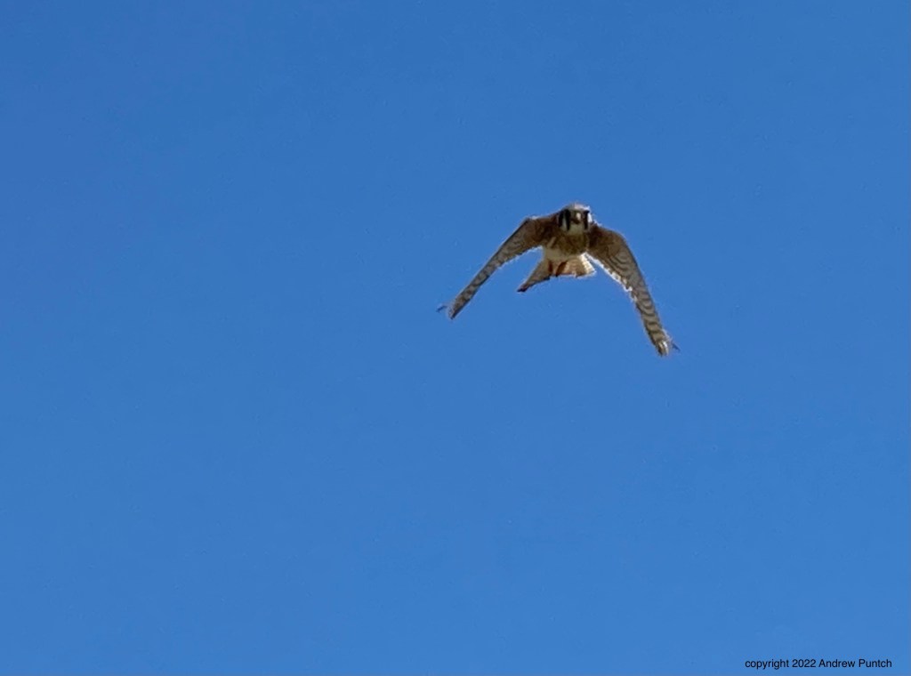 I climbed 58 steps to the top of an outdoor platform for exercise, and to take a look around this very flat part of the world. After a moment or two this Merlin began diving on me, likely protecting a nearby nest. A moment of searching did not turn it up, and since my presence was an unnecessary (and obviously unwelcome) distraction, I decided to stop looking and take my leave.