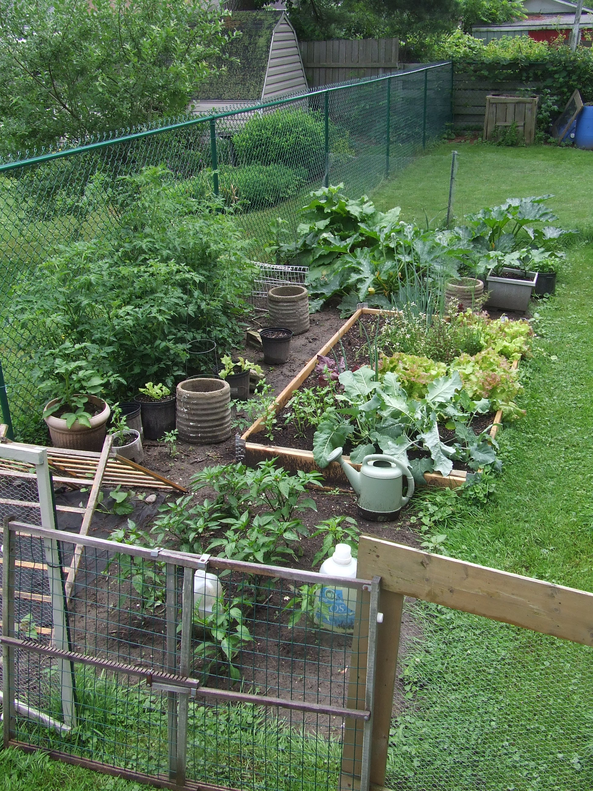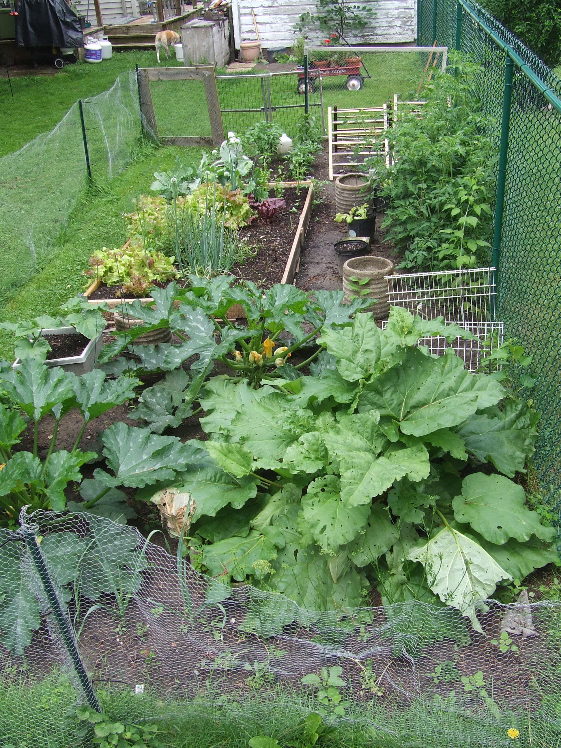 Rhubarb, zucchini (two varieties), habanero pepper, hot hungarian pepper, sweet (or bell) pepper), mesclun (lettuce) mix, carrots, beets, chocolate cherry tomatoes (approaching the top of the 5′ fence), sweet potatoes, basil, kohlrabi. Take a look.