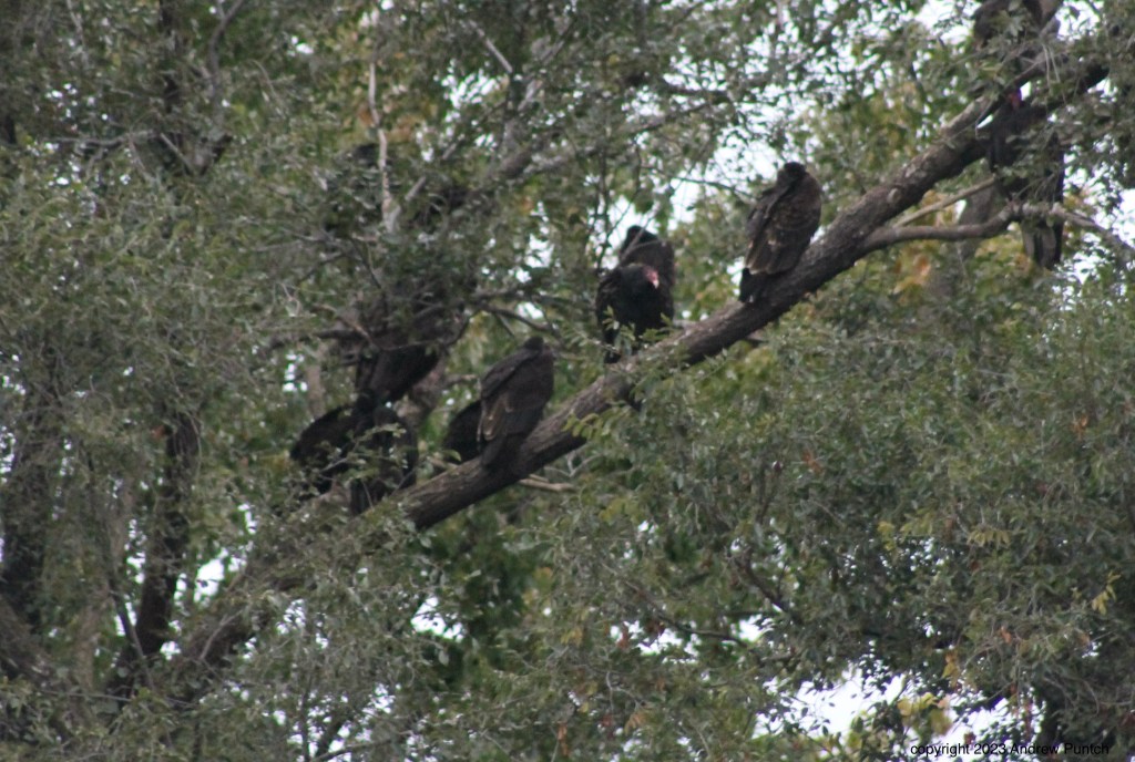 Turkey Vultures are migrating, heading south for the winter. A short time ago we marvelled at the dozens of them soaring, gliding into trees, going to roost for the night at this way station. These are only a few of the 50+ that we had the pleasure to see.