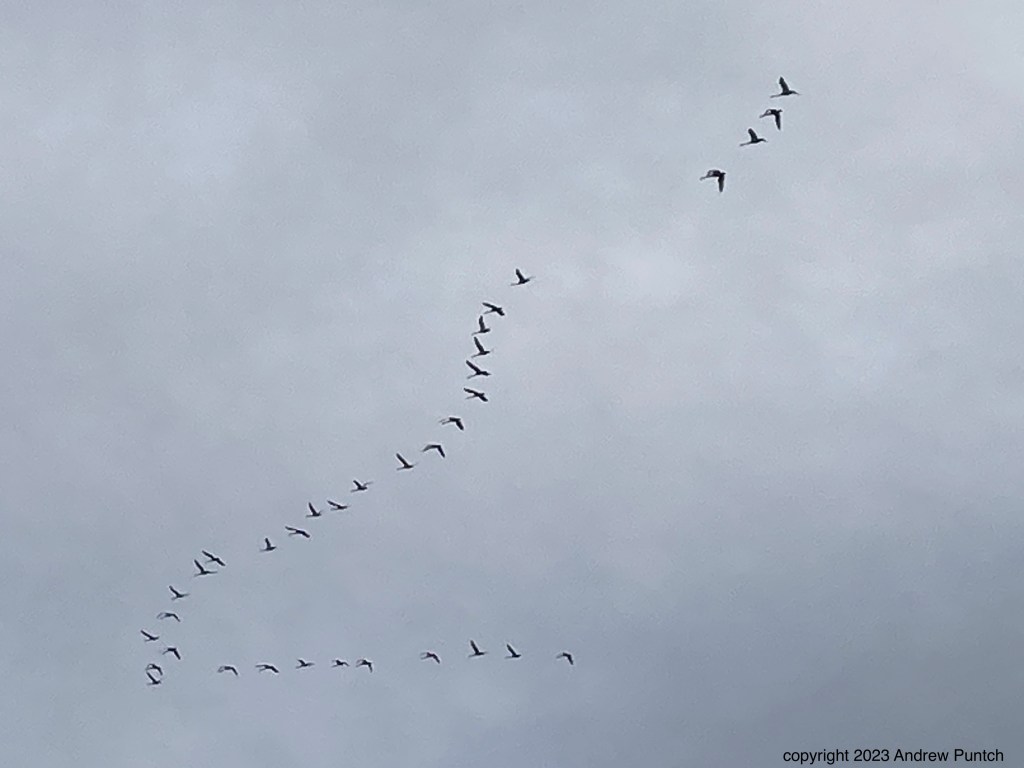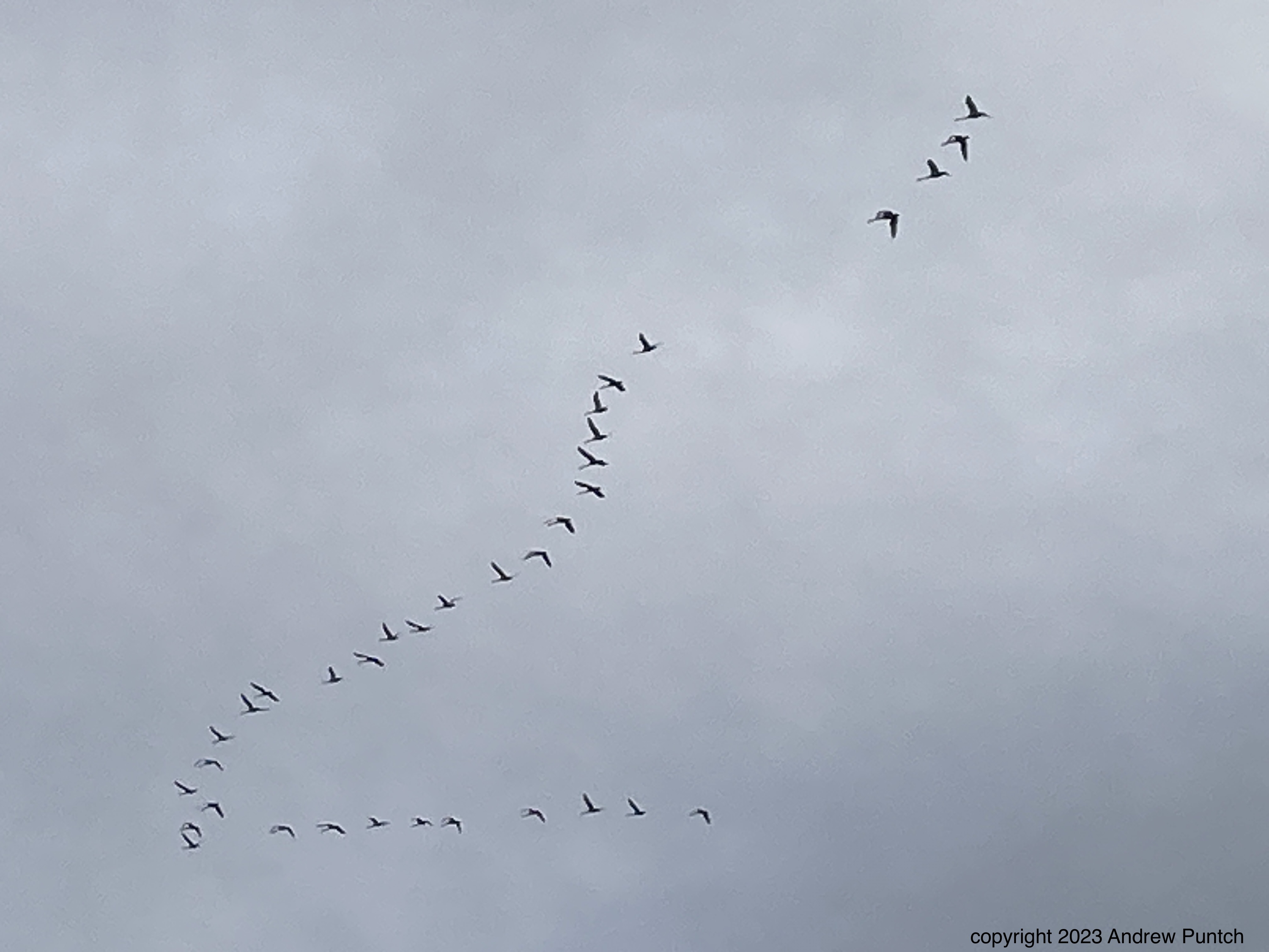 Faye and me were compelled to stop and watch this formation of Tundra Swans.