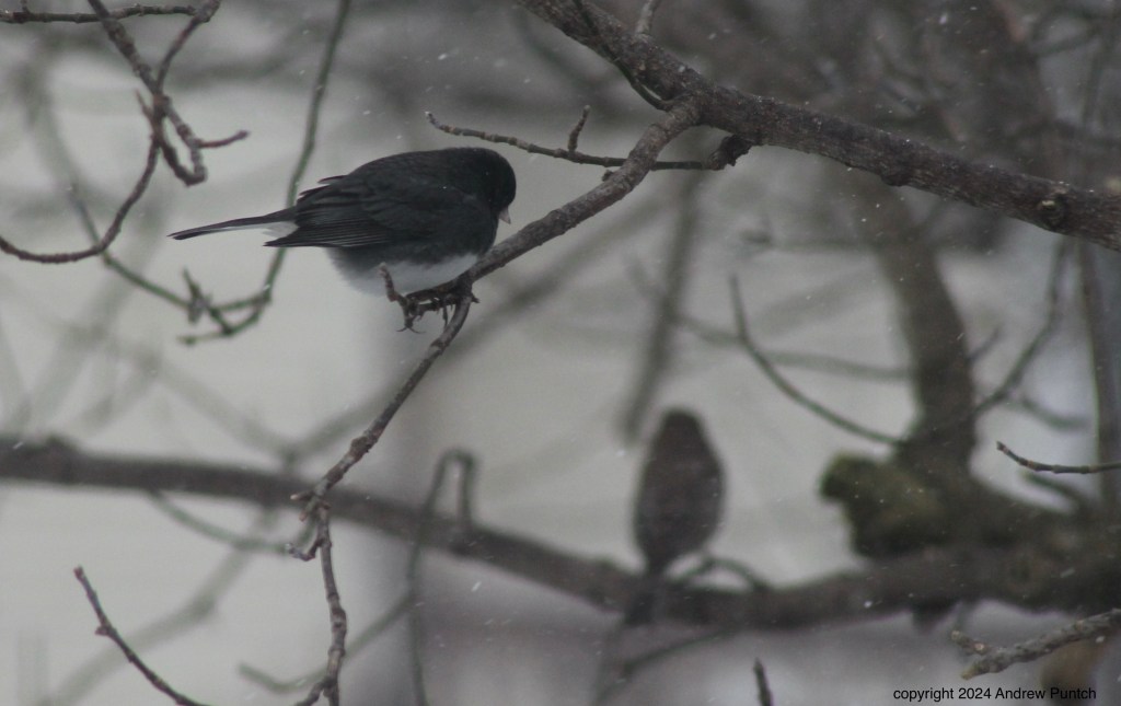 On a gloomy day, a Dark-eyed Junco surveyed the scene below before dropping to the ground to glean bits of seed from below the bird feeder.