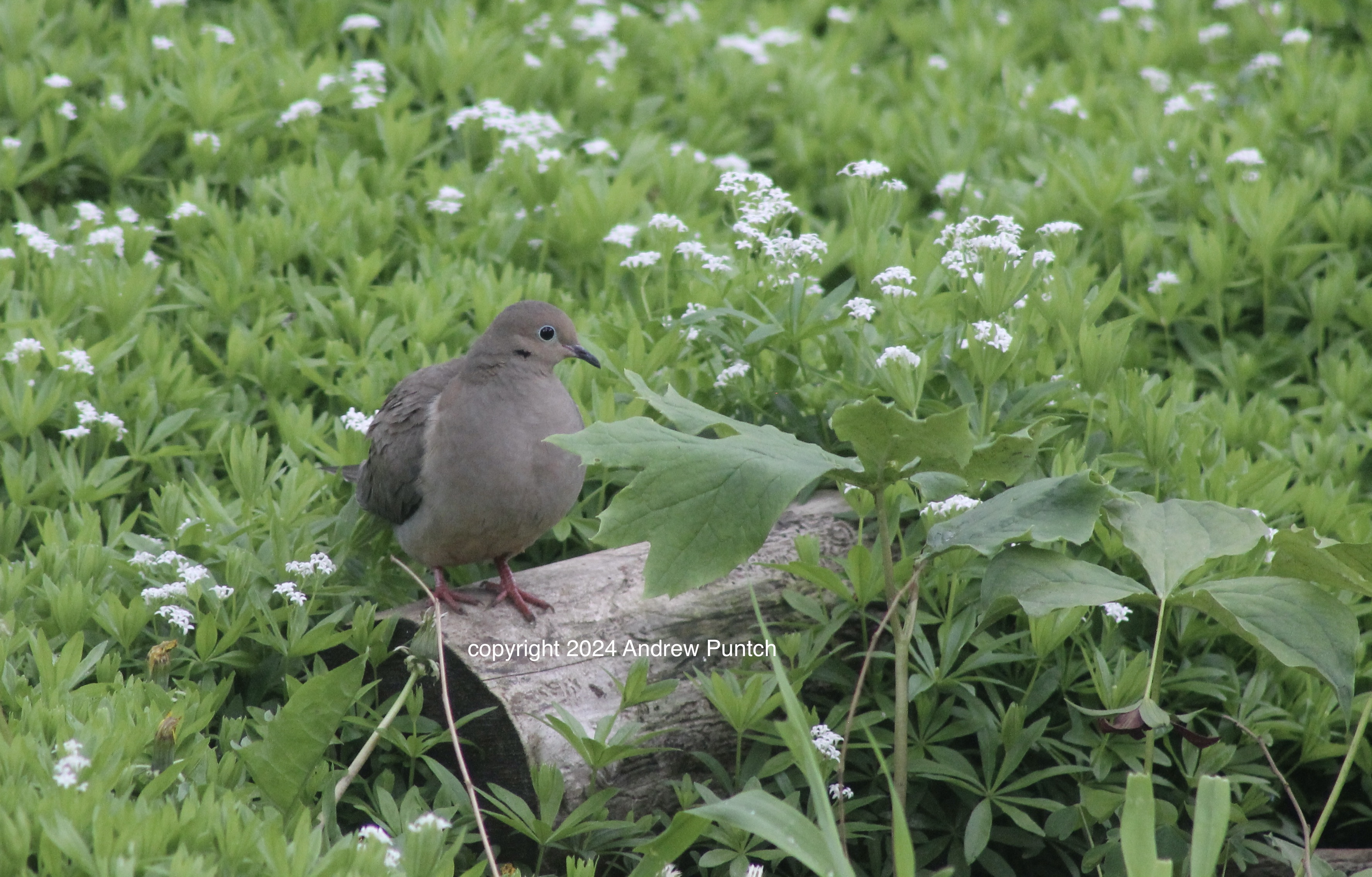 This Mourning Dove briefly perched on a log next to a Mayapple and two red trilliums just bast bloom, and in front of the bed of sweet woodruff.
