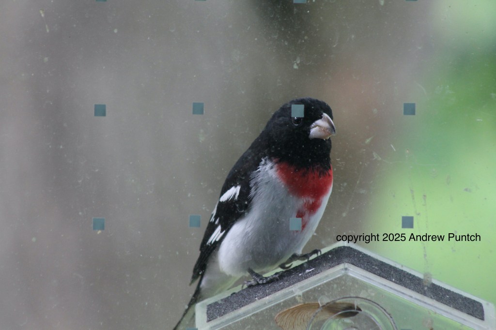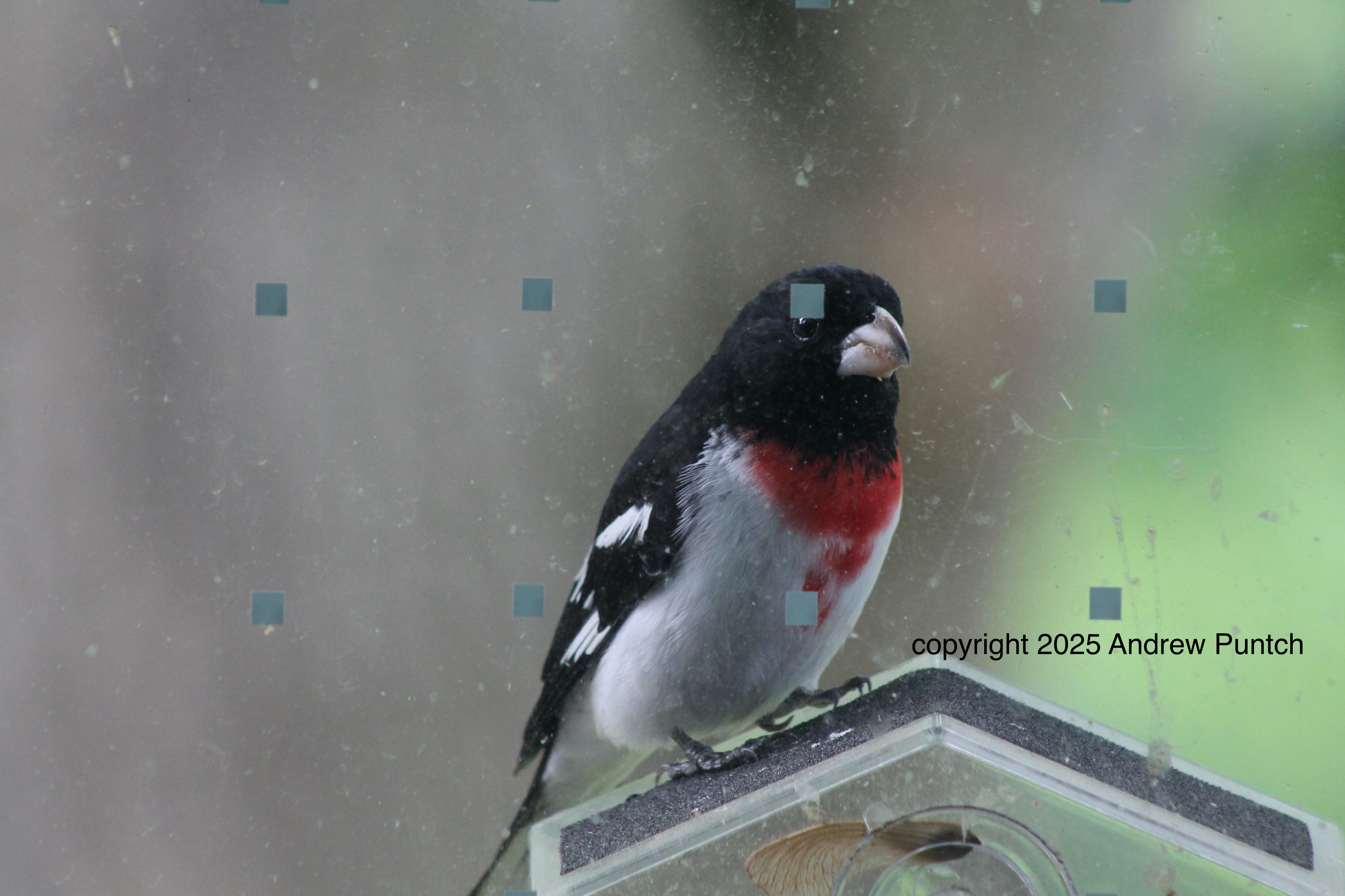 I captured this handsome Rose-breasted Grosbeak perched on the roof of the window bird feeder. The small squares are fixed to the window and act as a visual reference/barrier, preventing birds from flying into the window and being injured by the impact. Since affixing the squares two years ago, the only impacts have been low-speed and non-injury causing.
