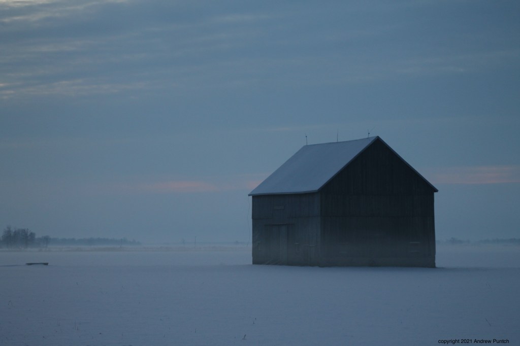 On a marvellous late winter morning, this tin barn was softly lit by pre-sunrise light, with the moon setting above it. I was blessed to come across this scene.