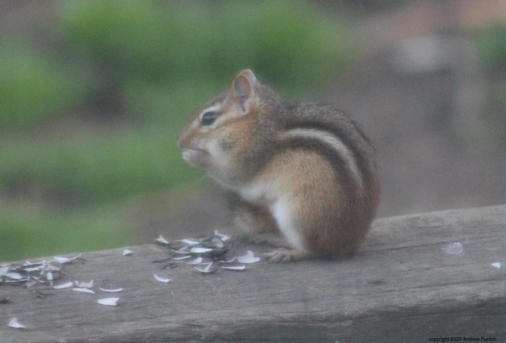 I happened to look out the laundry room window at the right time to see this chipmunk at the edge of the deck, finishing a meal of sunflower seeds. This appears to be a bit out of focus because I shot it through the screened laundry room window.