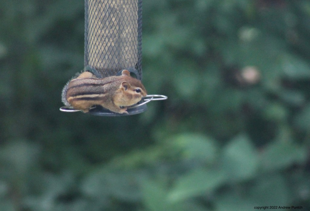 As I looked out the window this chipmunk shinnied up the shepherds’ crook to raid the bird feeder. I hurried to grab the camera and returned in time to capture it filling its cheek pouches with tasty sunflower kernels. We don’t mind sharing with it.