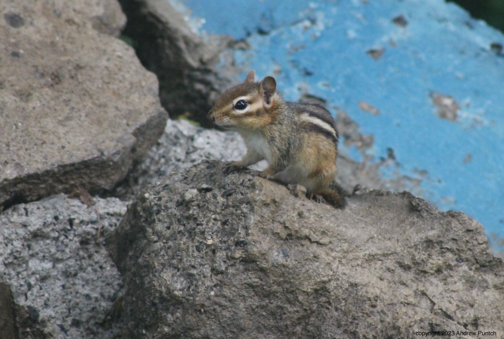 I do not know, cannot know, whether this one of our (at least two) resident chipmunks was resting, remaining motionless in an attempt to blend into the scenery, (anthropomorphising here) waiting for me to finish photographing it from about four meters away, or for another reason. Once I finished I called the dogs and we went inside so it had some undisturbed, safe time.