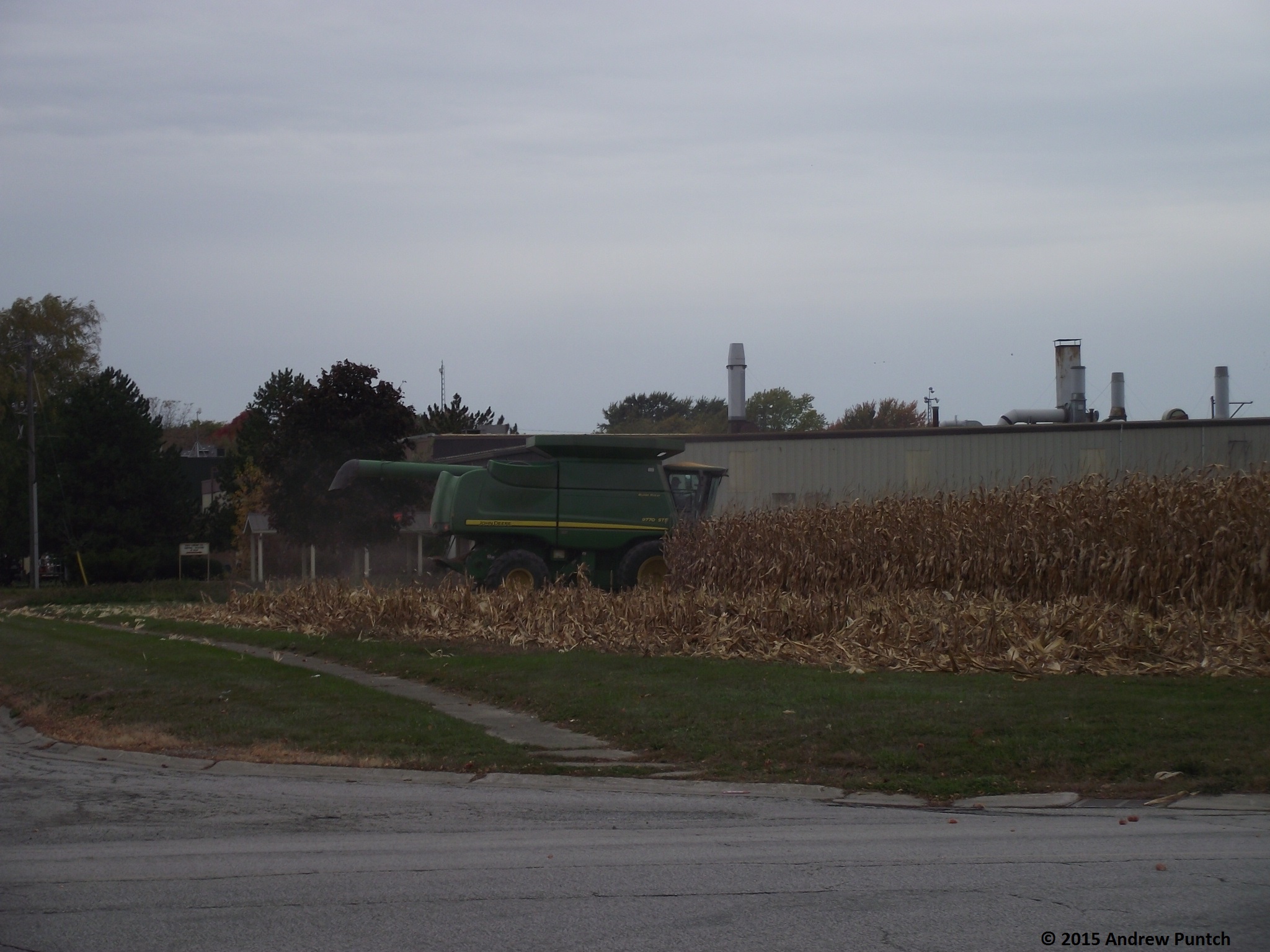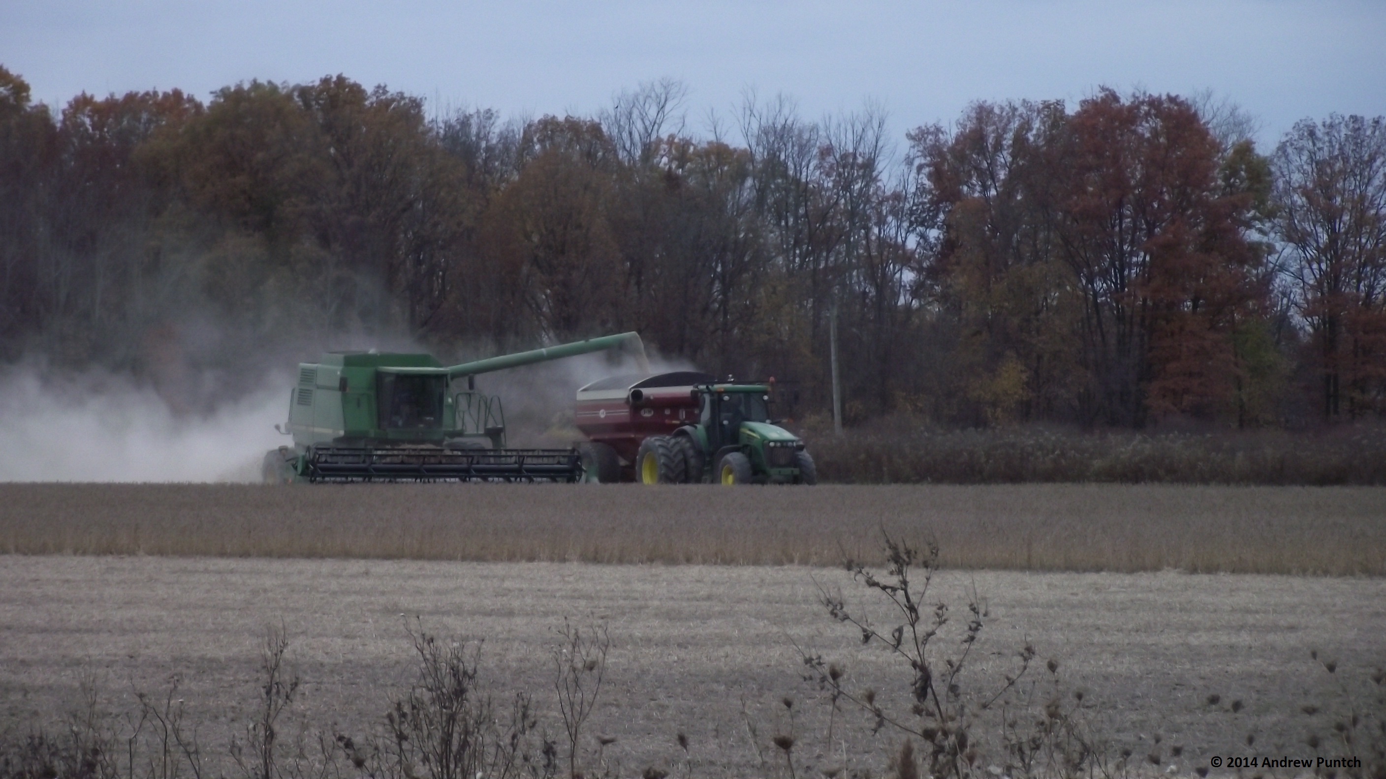 A combine cuts the first swathe through a soybean field. The last swathe may be done before I see the field tomorrow morning.