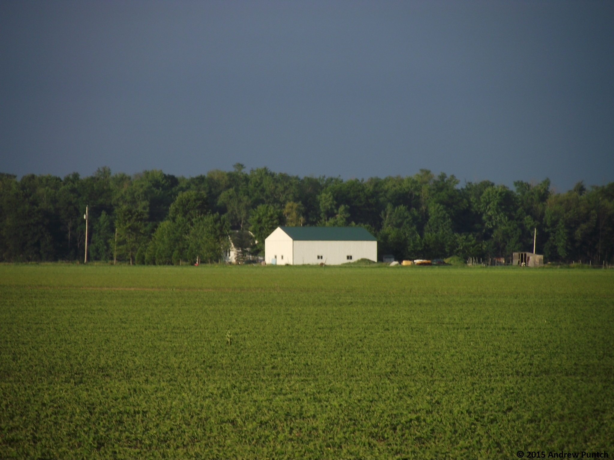 A bright white farm house offers a pleasing contrast to a hazy sky and the deep green of field and bush.