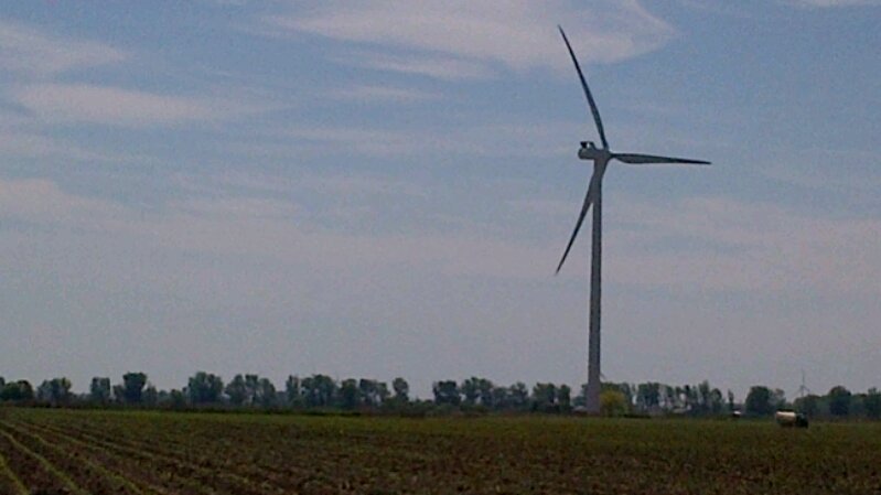 In a scene of soft green, brown, and grey-blue with a dash of white, a red farm shed makes a vivid counterpoint.