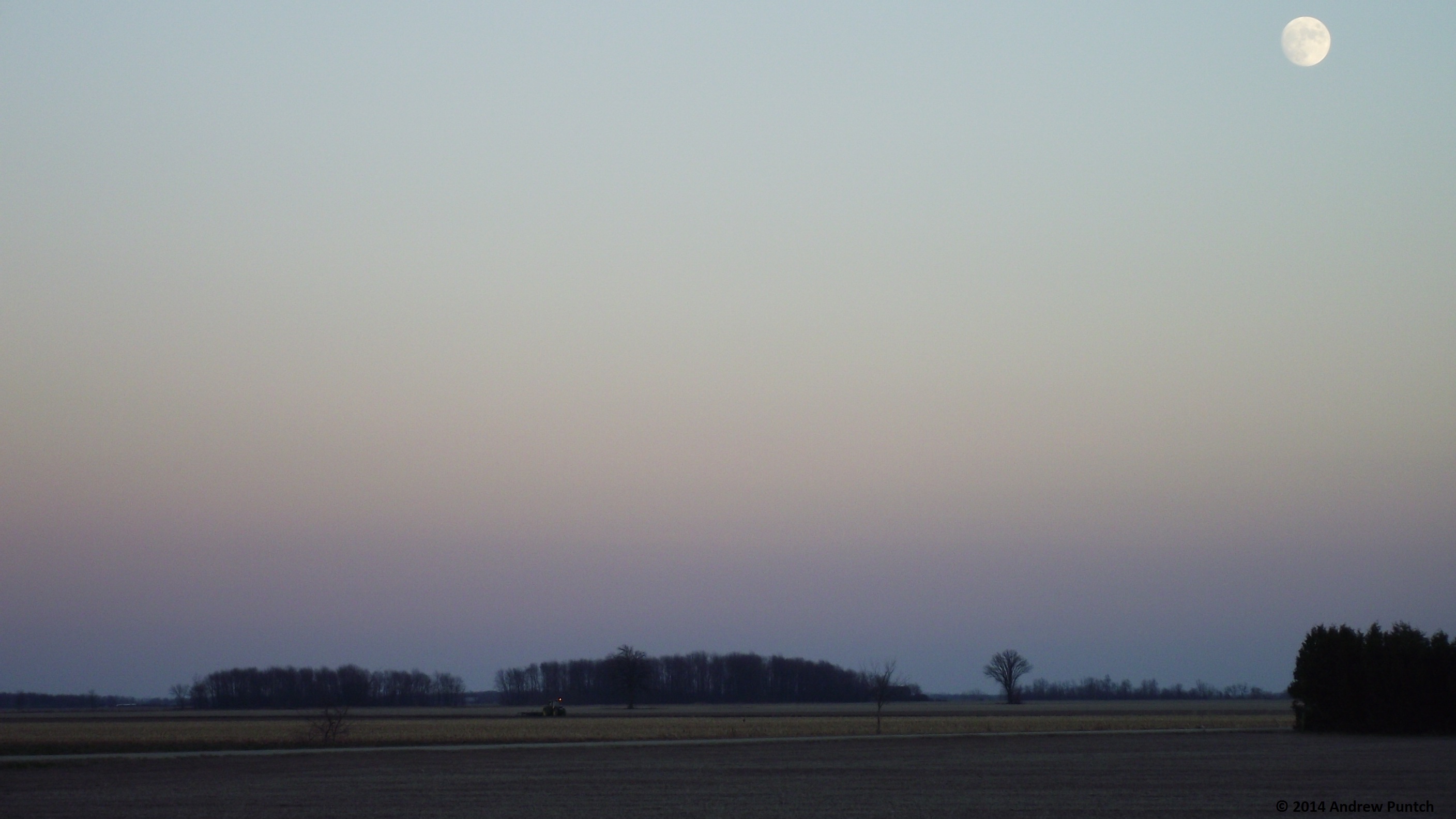 Lines plowed into a field lead to a farm house, outbuildings, and bush.