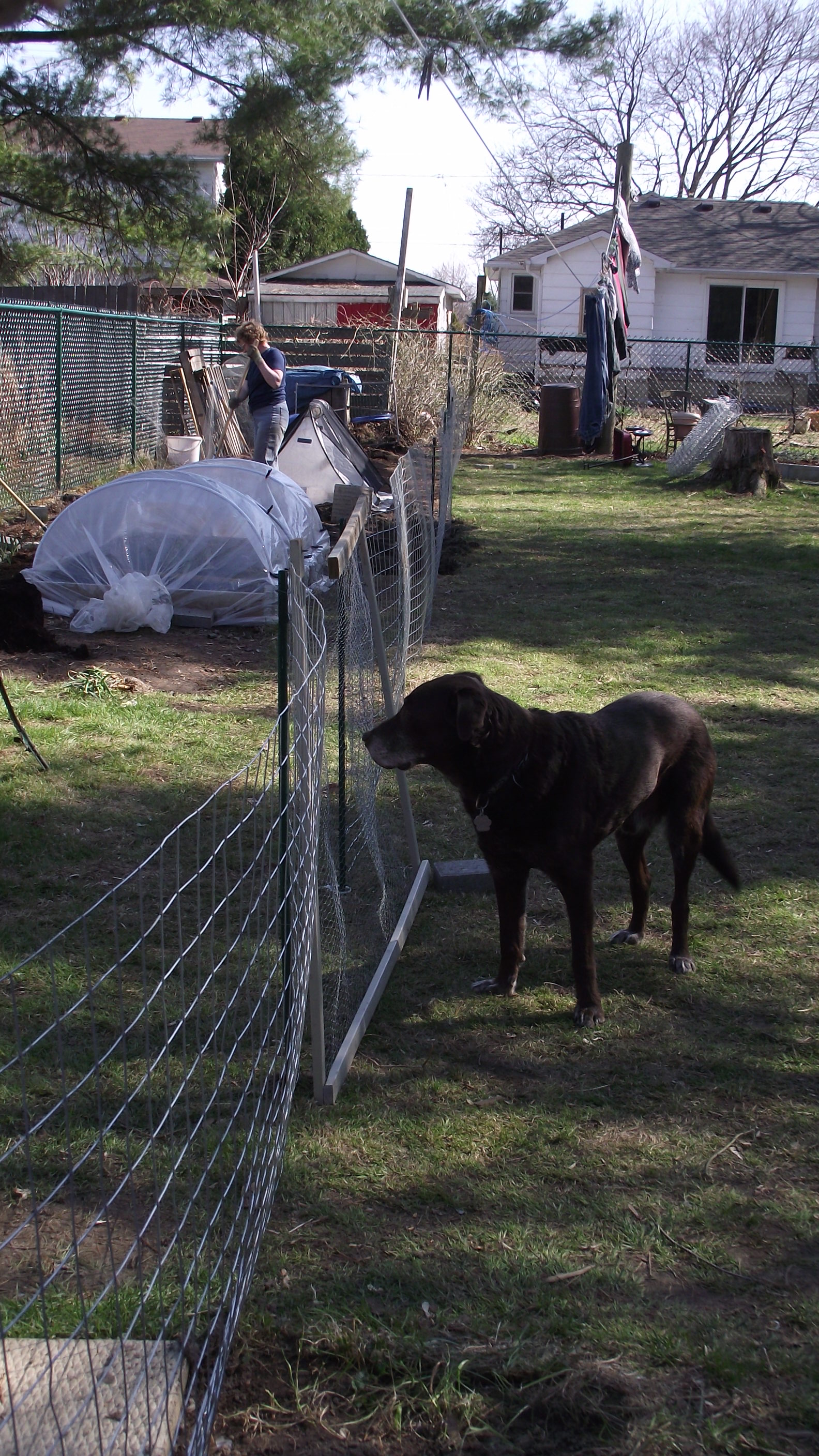 In previous years we fenced off a small portion of the yard for our vegetable garden, using chicken wire. That served the purpose yet was usatusfactory for several reasons. This year we decided to greatly expand our garden and concomitantly use a less flimsy barrier. We agreed to fence off the entire portion of the yard 8′ in from the east chain link fence. This not only encloses our current and expanded garden, it allows for future expansion and protects our compost piles from three marauding dogs named Achilles, Kendal, and Stella.