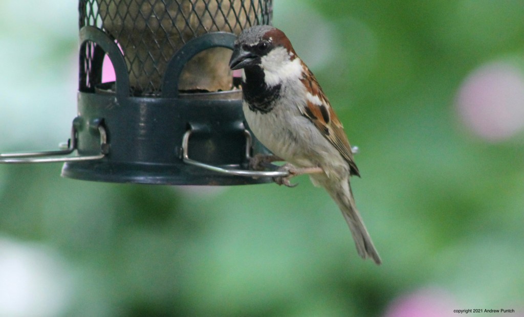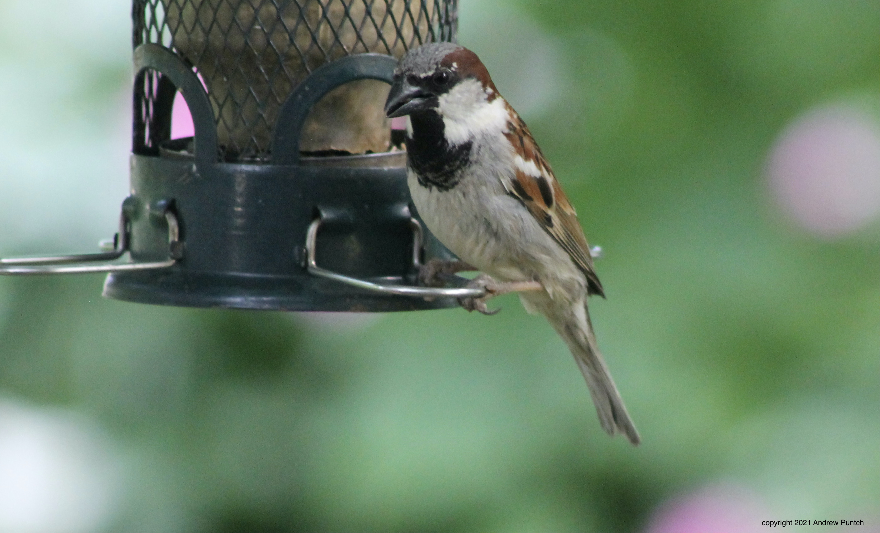 I captured this handsome Rose-breasted Grosbeak perched on the roof of the window bird feeder. The small squares are fixed to the window and act as a visual reference/barrier, preventing birds from flying into the window and being injured by the impact. Since affixing the squares two years ago, the only impacts have been low-speed and non-injury causing.