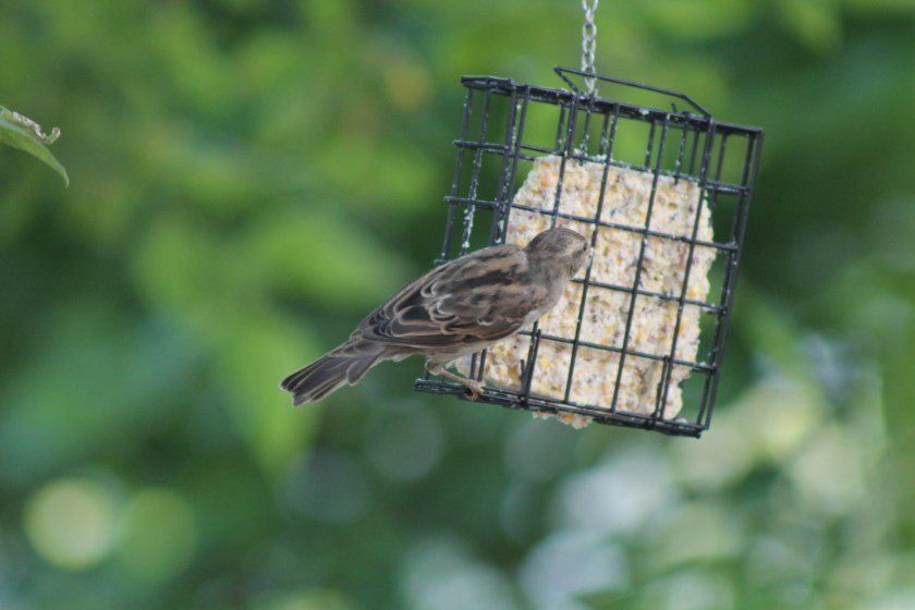 A House Sparrow pops up for a look to see if the Cooper’s Hawk, which attempted to ambush birds at the feeder, has moved on.