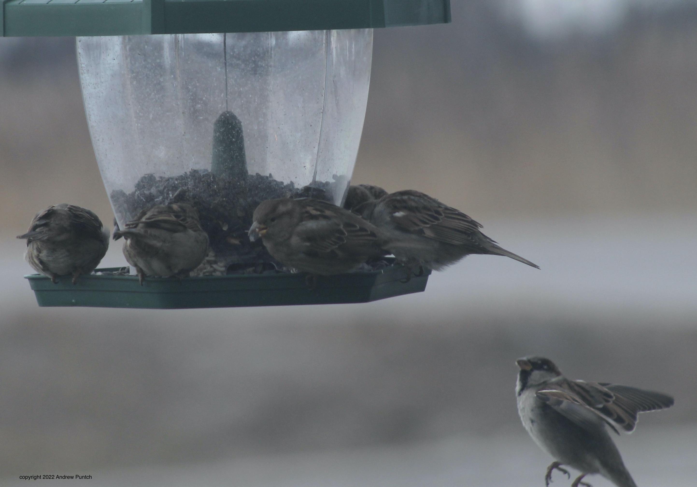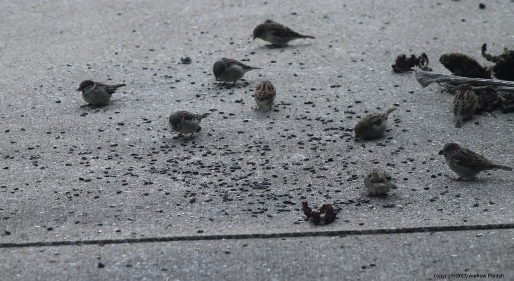 House Sparrows feed at the sunflower seed buffet.