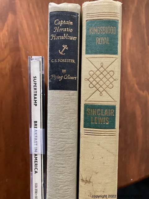 Since Faye works midnights (boo hiss) starting Sunday night we decided to have a good Valentine’s Day meal today. We killed time at a thrift store before picking up our Valentines’ Day lunch and I found some small treasures. I like the Horatio Hornblower series, and have never read Sinclair Lewis. Both books appear to be first editions. ‘Breakfast in America’ has been on my ‘look for’ list for a while. Cost, all in? $2.54.