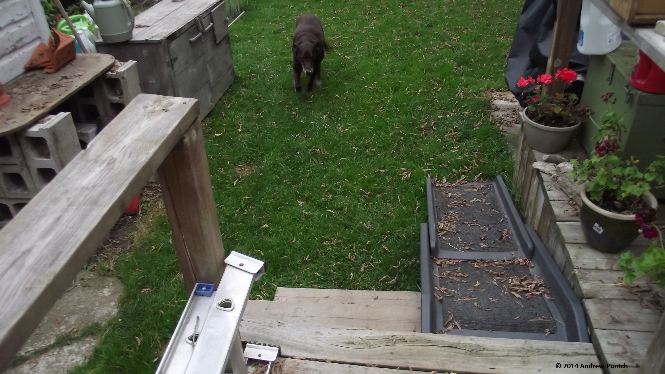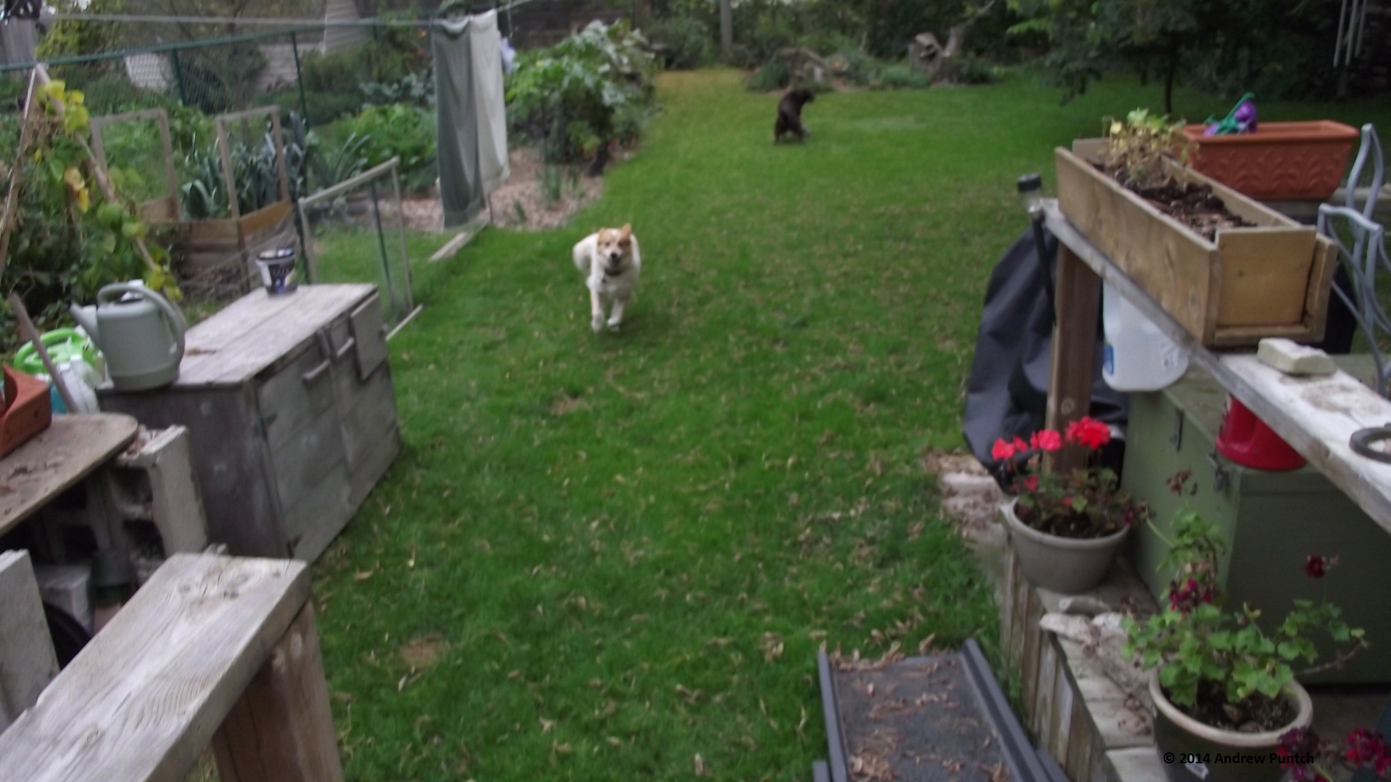 On getting home, I let myself in leaving the door open. I drop my bag and let the dogs out of the living room, then follow them outside. Achilles romped this afternoon. Kendal tended to business first, then galloped up, his greeting no less enthusiastic.