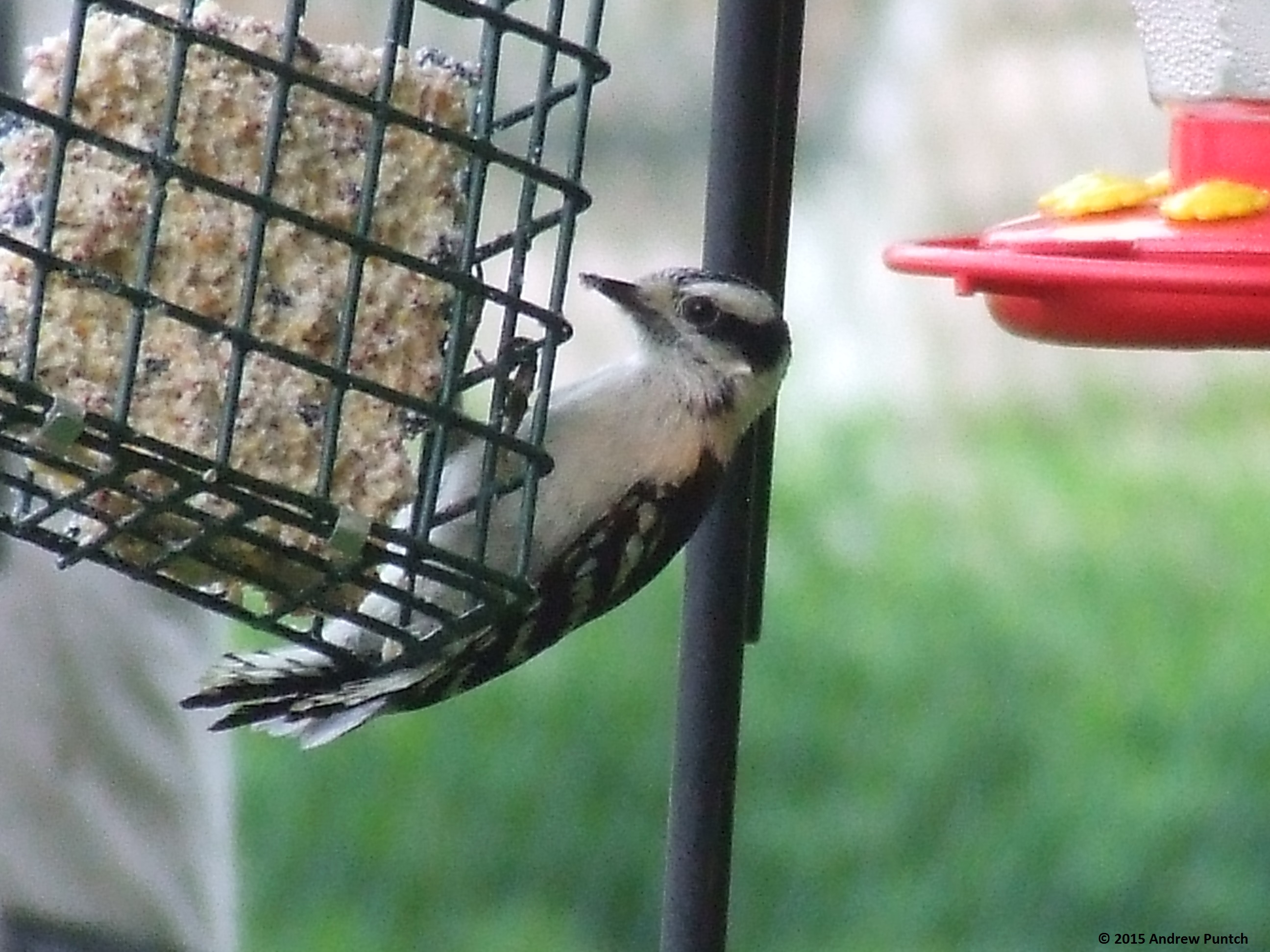 I rummaged through photos and came across this one from July. I put out suet cakes for a week or two and this female Downy Woodpecker (link goes to allaboutbirds.org) regularly visited. She also visited the hummingbird feeder, right background, and I think was able to extract some nectar.