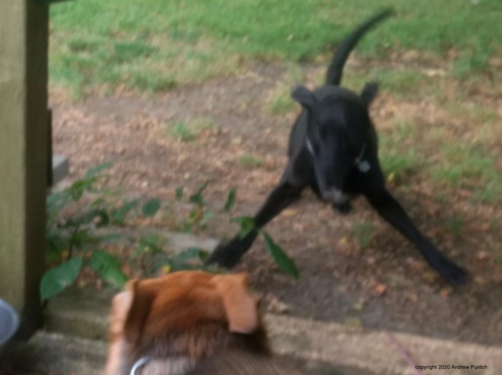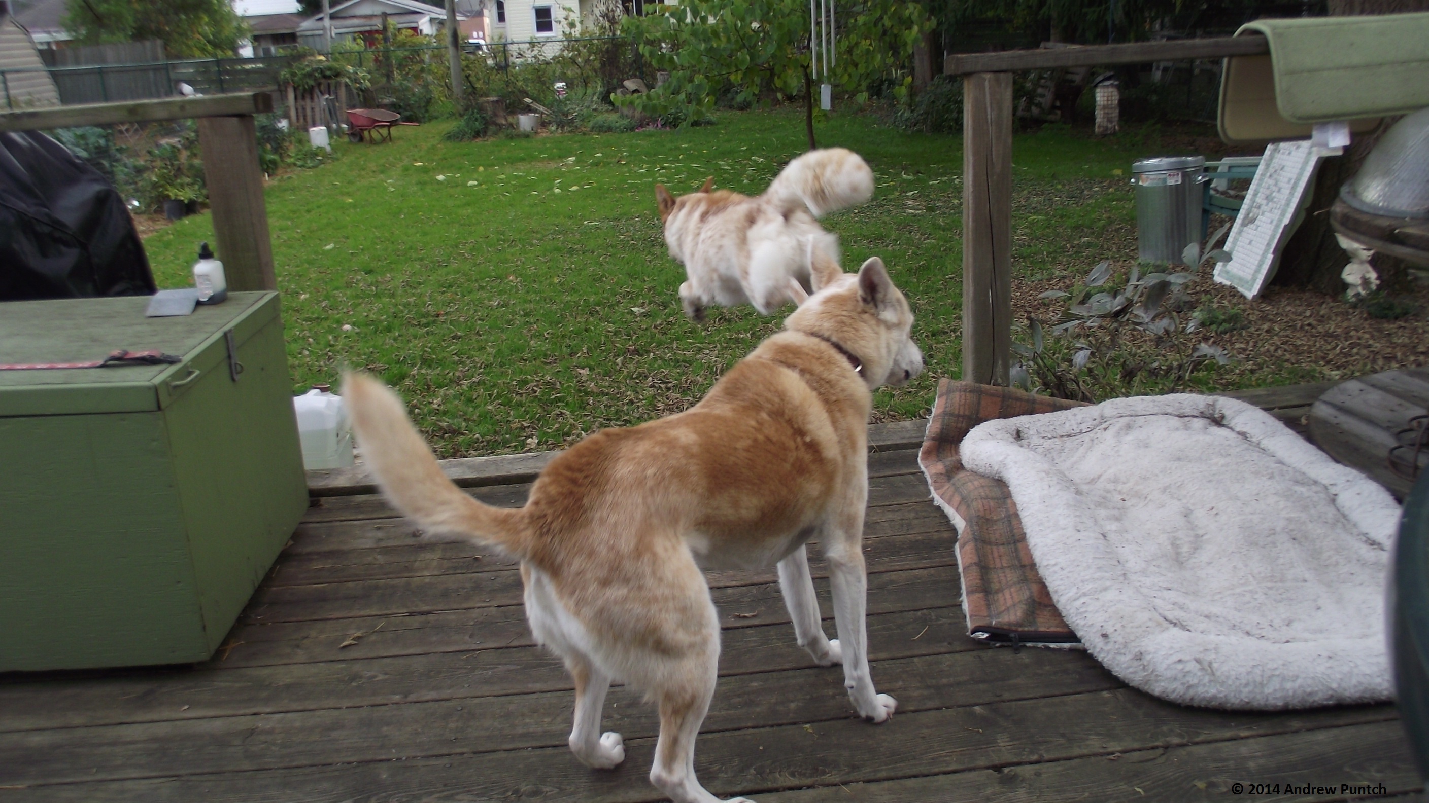 Beyond Stella, Achilles launches himself off of the deck. When he lands he will charge around the yard before leaping back onto the deck to race past Stella, who awaits developments.