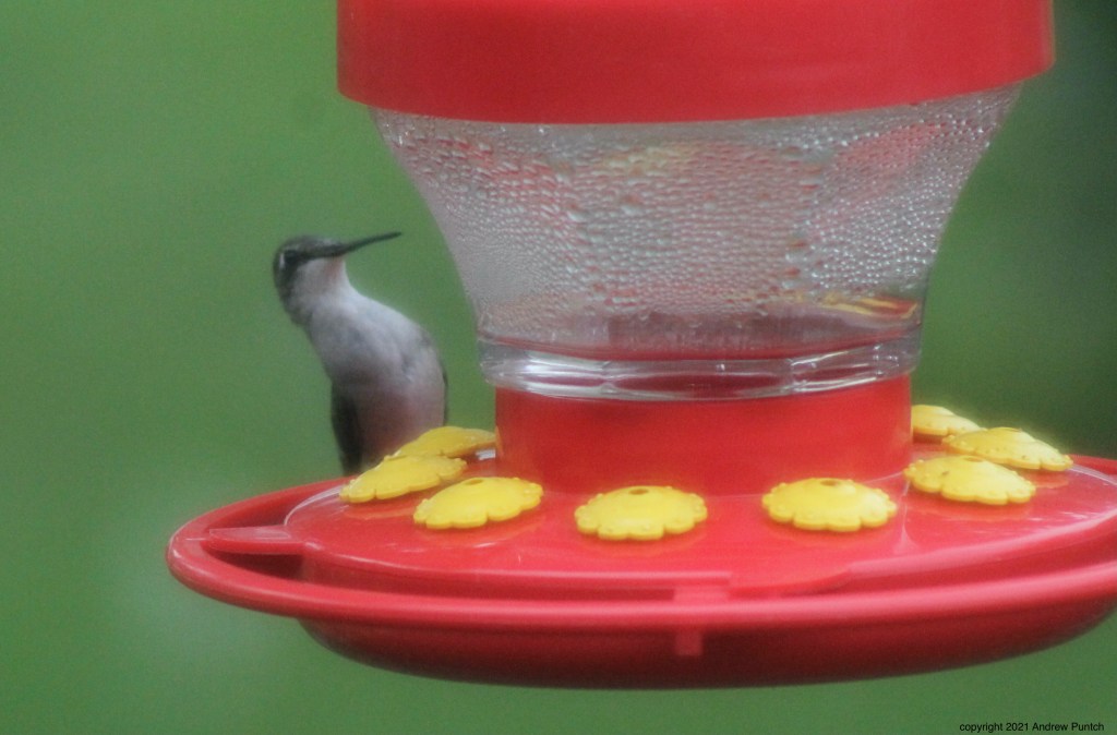 Throughout the day and every day for more than two weeks, two immature and/or female Ruby-throated Hummingbirds contested the right to visit and feed from our feeders. Here is one of them, photographed from about 2.5 meters away. Image appears a bit out of focus due to shooting through the kitchen window screen.