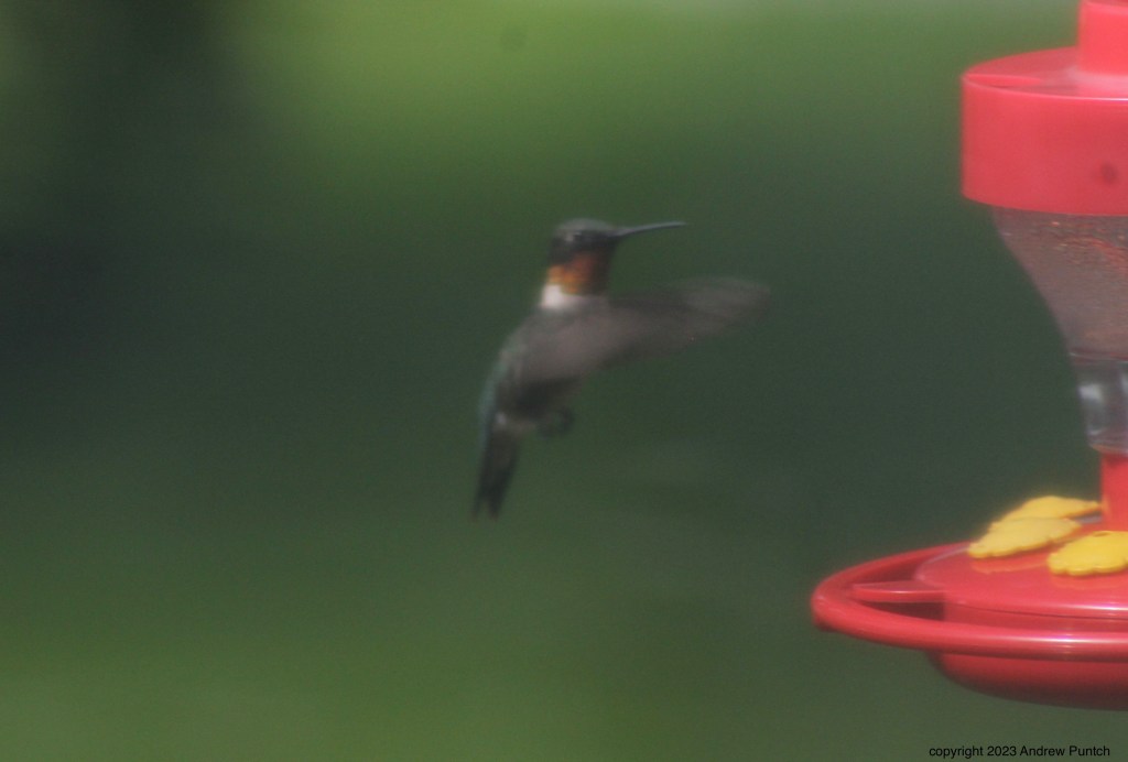 A male Ruby-throated Hummingbird hovers near the feeder. Shot through the kitchen window and attendant screen, so a little blurry.