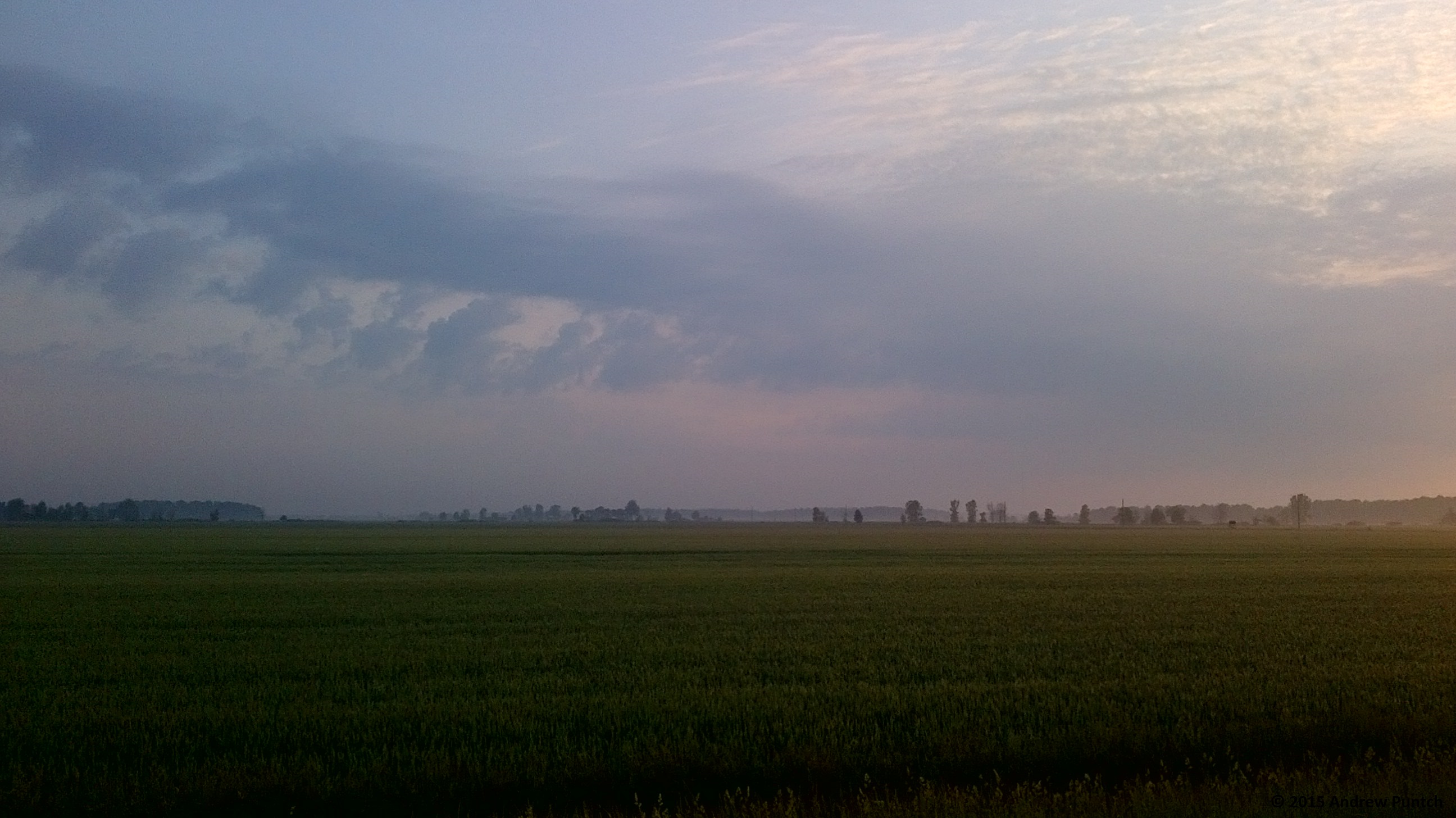 Trees in the distance, wreathed in morning fog.