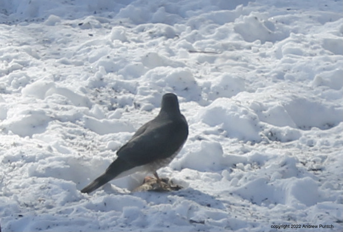 A large number of birds of several species visited yesterday, a little more than two days after a major snowstorm. There had been very little activity today, and early this afternoon I saw why.