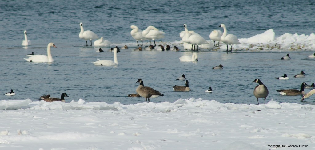 For the past three weeks, temperatures have been mostly mildly below freezing to well below. The St. Clair River has largely frozen over so open water is limited. As a result, overwintering waterfowl been compressed into small spaces. I saw in this small open water area Mute Swan, Tundra Swan, Canada Goose, Redhead, Bufflehead, and possibly another species.