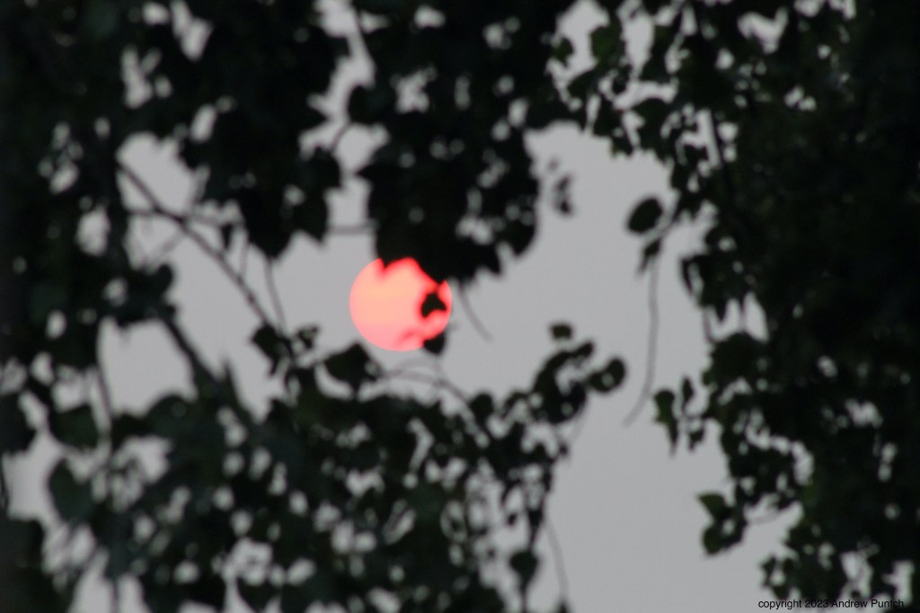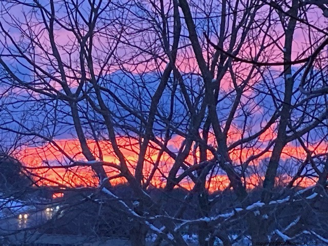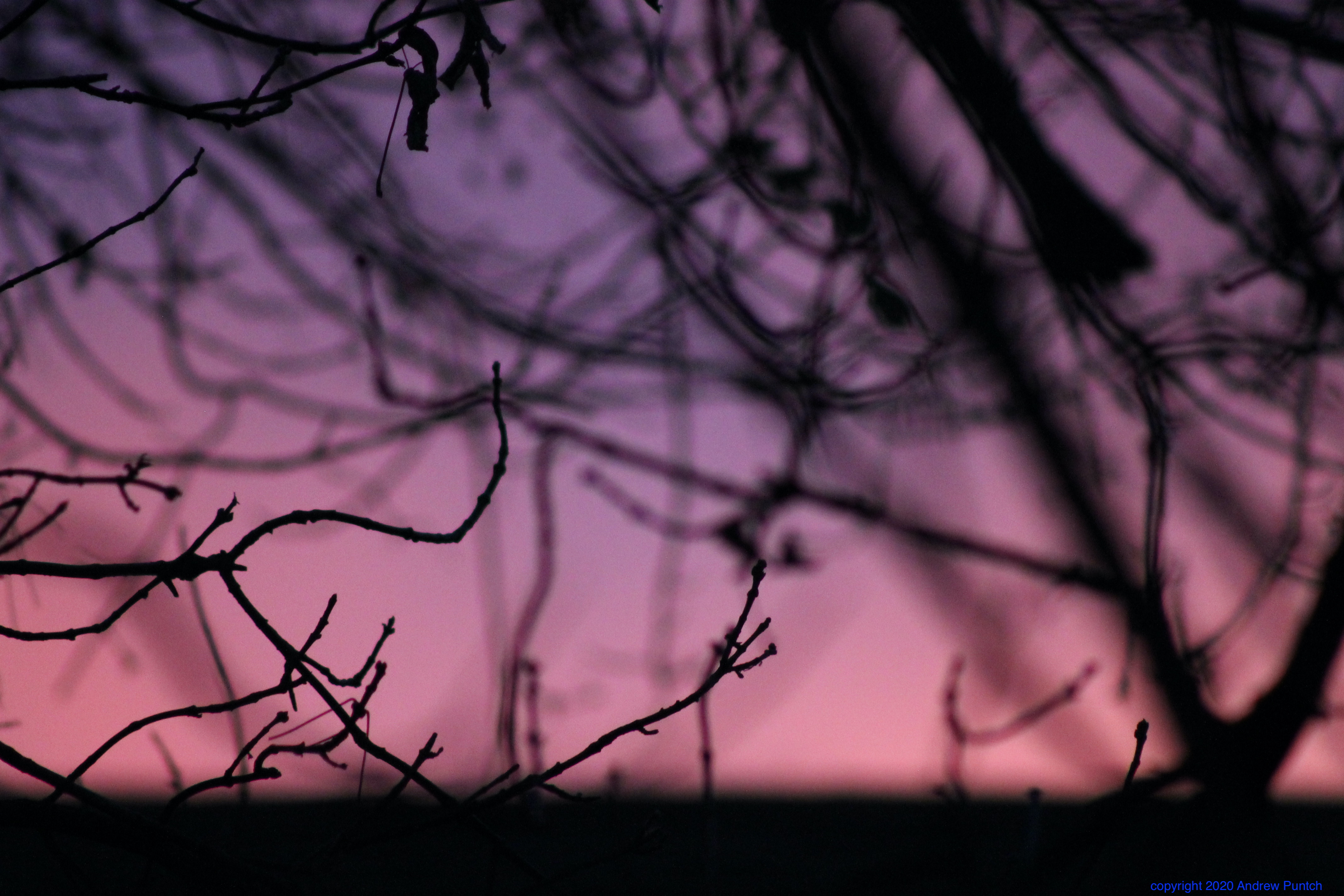 A recent sunset made the clouds glow. I like how the trees lean into the image, framing the scene.