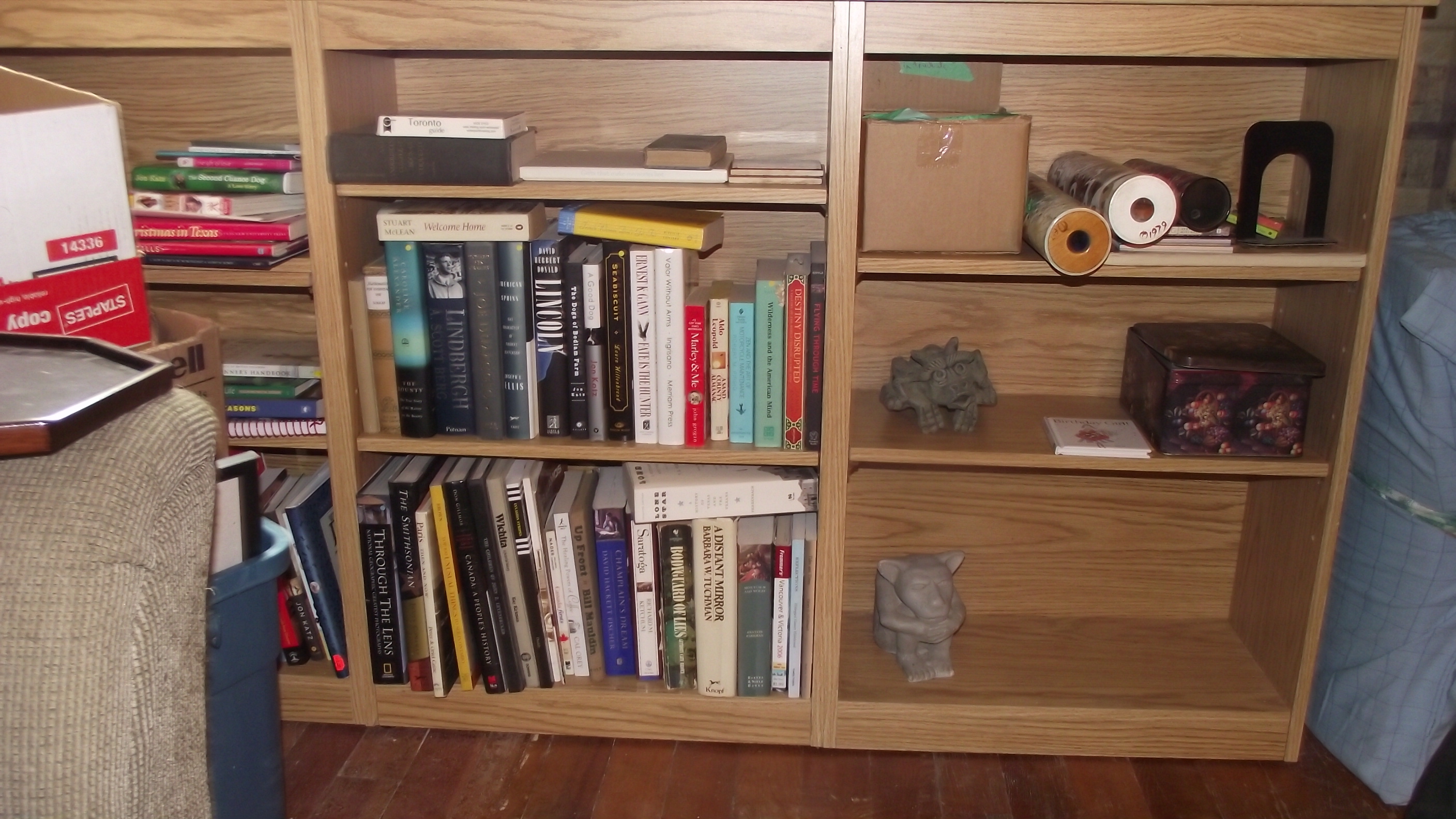 This is one thing I puttered about today. We had some electrical work done and the prep work included unloading a bookcase. I re-stacked many of the books, roughly following the Dewey Decimal System, as well as found a restung place for a few of Faye’s gargoyles,