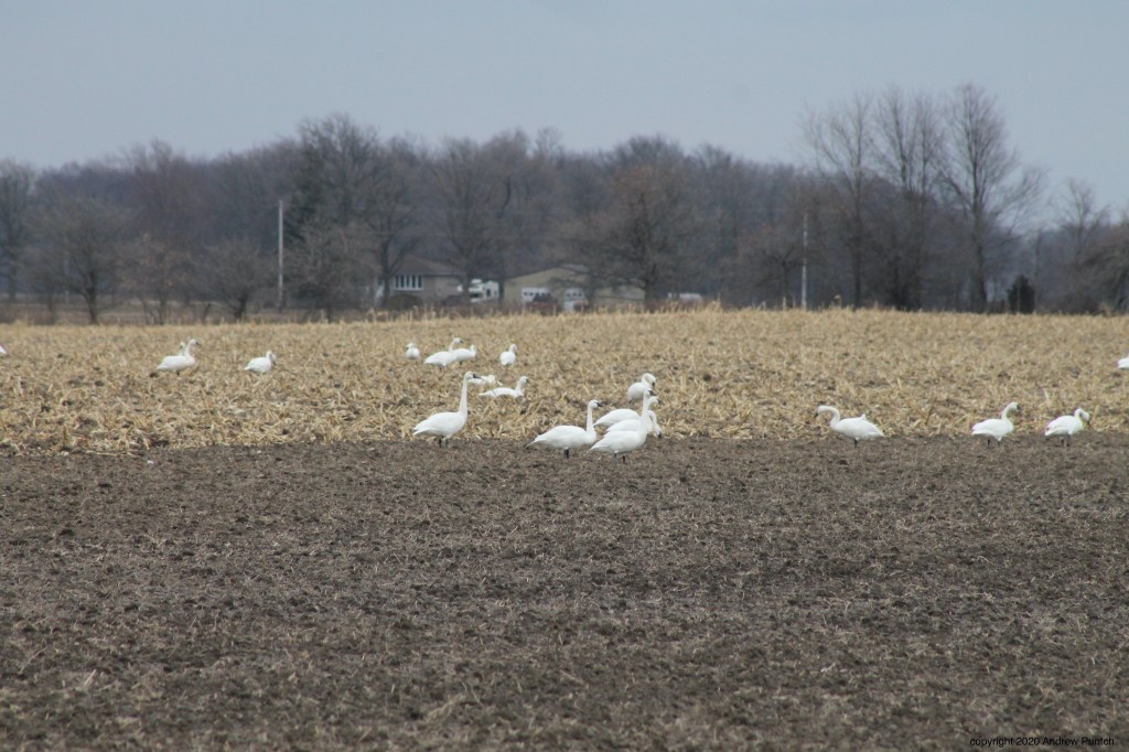 Tundra Swans gather by the thousands in the corn- and potato-fields near Grand Bend Ontario as they start their journey to their nesting grounds in the far north.