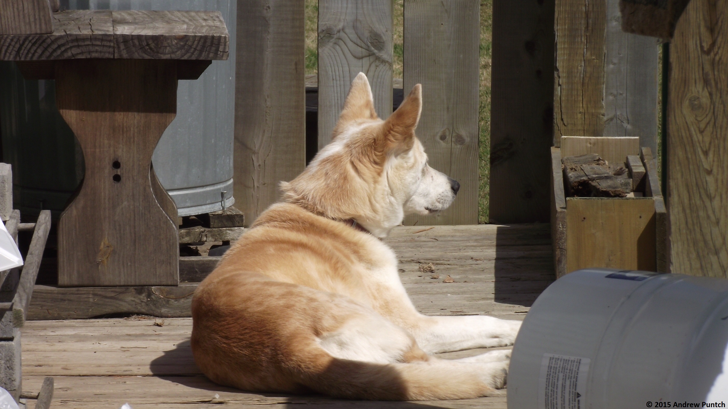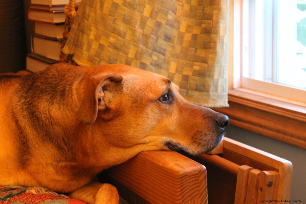 It turned out to be a small scrape on the pad, rendering it sensitive. Since she was largely back to normal by Monday, Labour Day, we decided to continue watching through the week. She’s fine, back to her normal self. Here she is tonight, watching the world go by.
