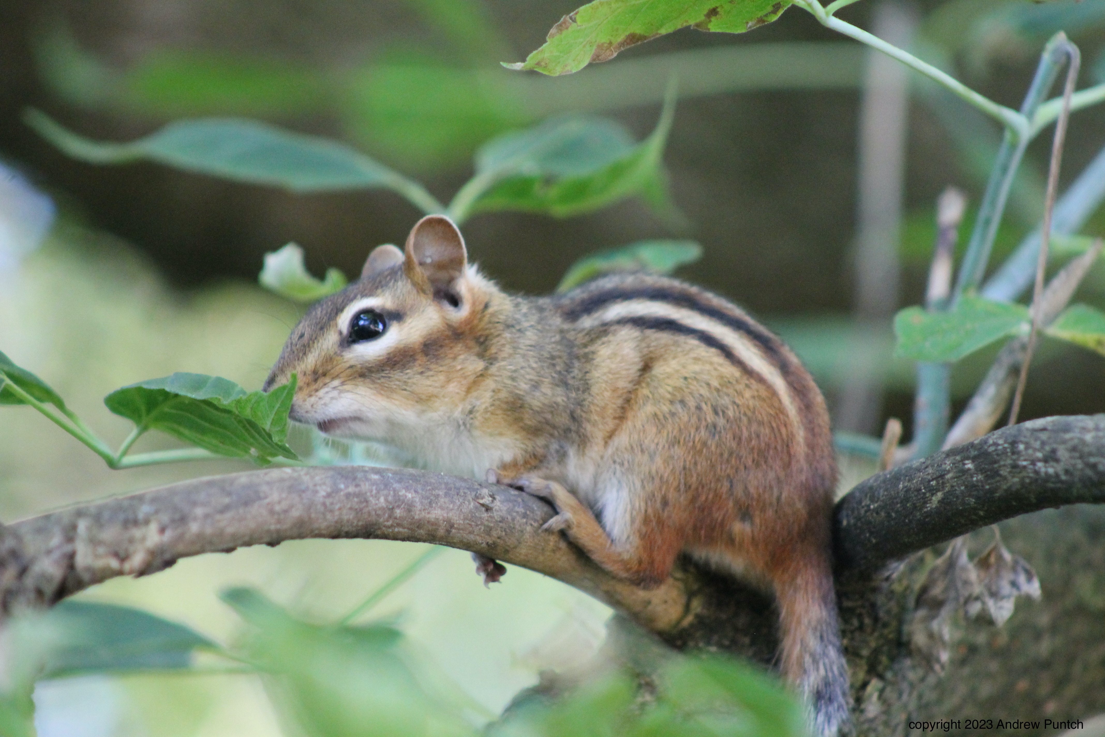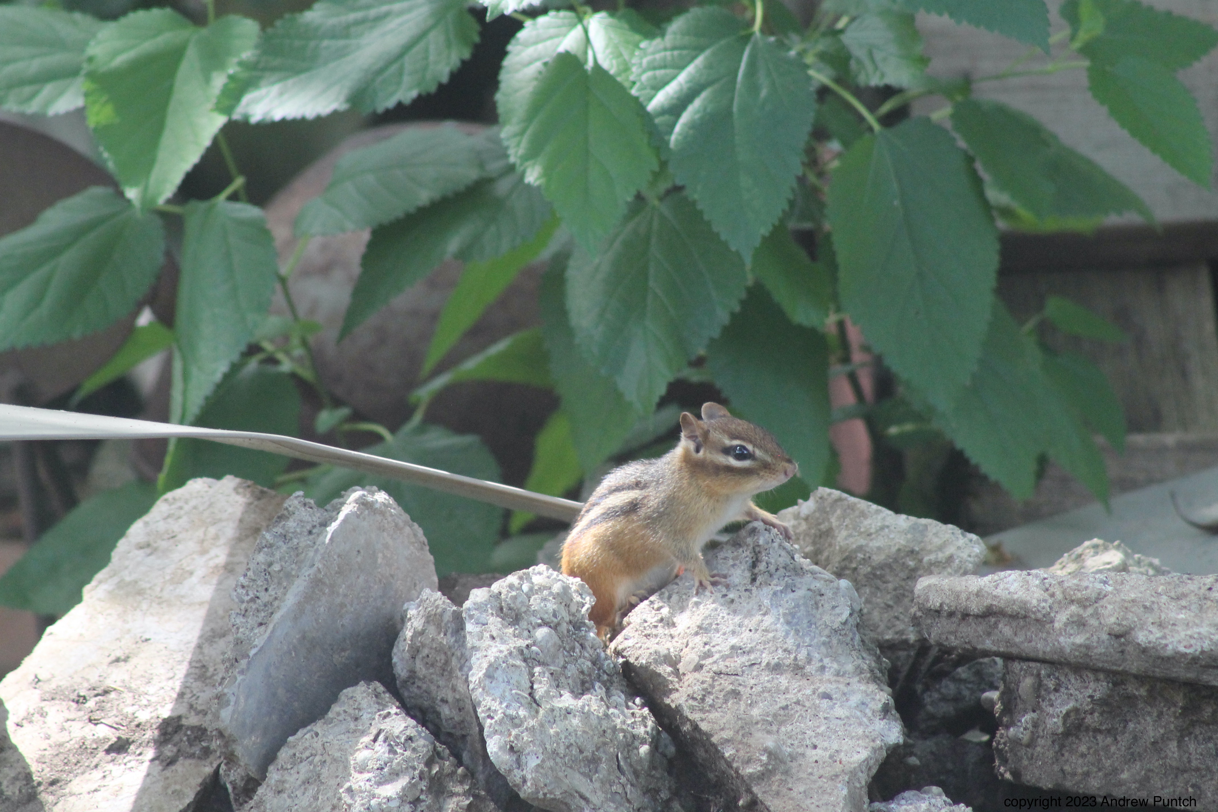 As least two chipmunks live in and around our backyard. Faye captured this one the other day.